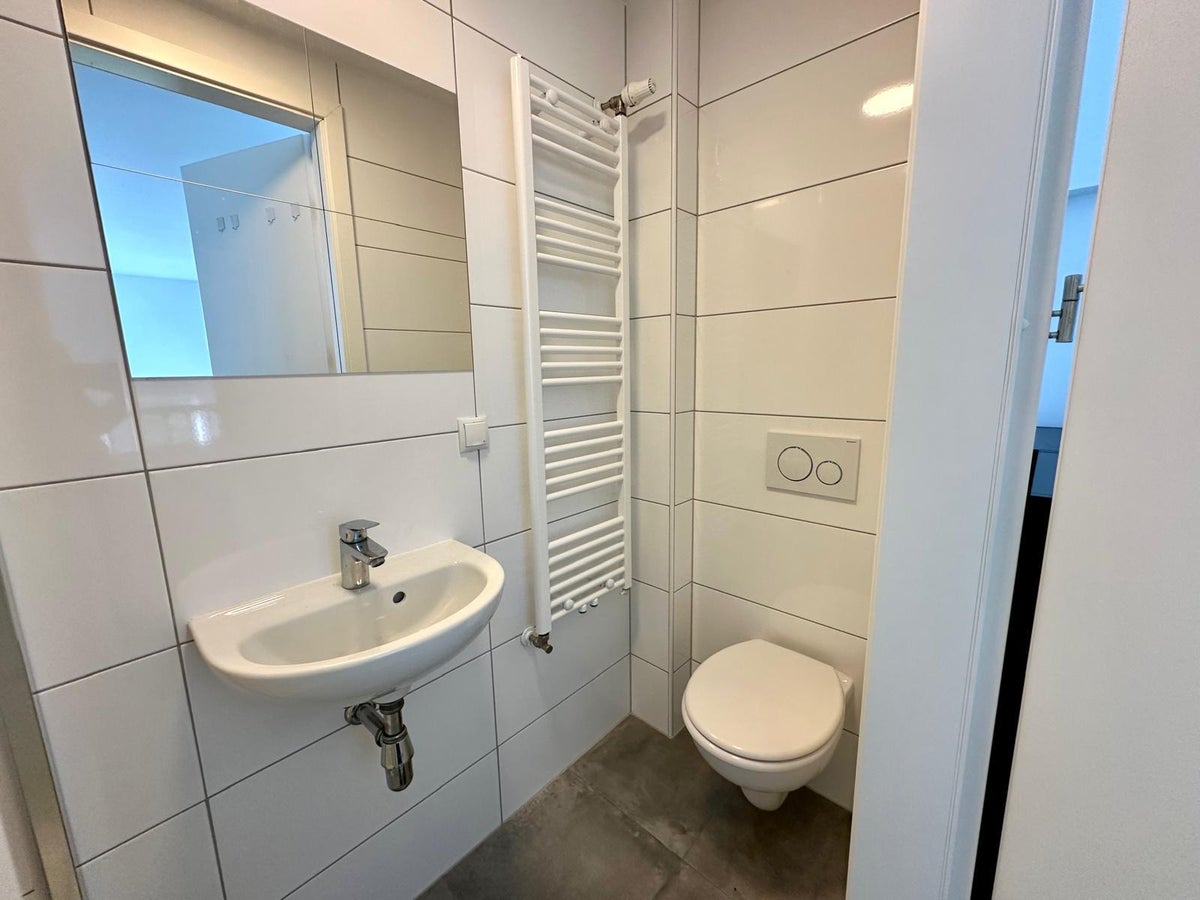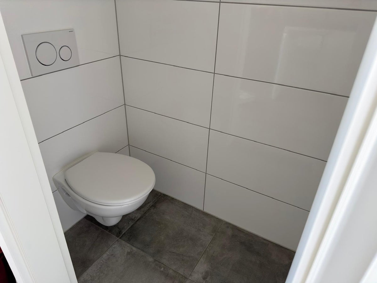 De badkamer is compleet met een douche, wastafel, toilet en een handige handdoekradiator.