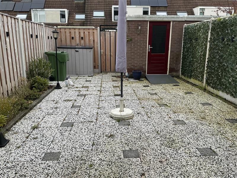 De woning ligt in een autoloos erf, met een parkeerplaats vlakbij de woning. Indeling: Begane grond: u komt de woning binnen via de hal. Aan deze hal grenzen de woonkamer met open keuken, het toilet; ruime bergkast en de trap die u toegang geeft tot de 1 e verdieping. Via de woonkamer komt u in de ruime achtertuin met stenen berging. Eerste verdieping: via de trap komt u op de overloop.