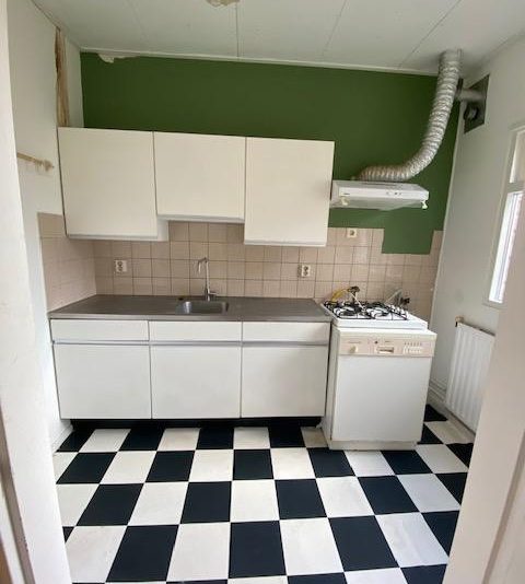 Ook de keukenmuren worden nog wit geverfd. KENMERKEN: - Huurprijs: €980 per maand (exclusief gas, water, licht en internet)