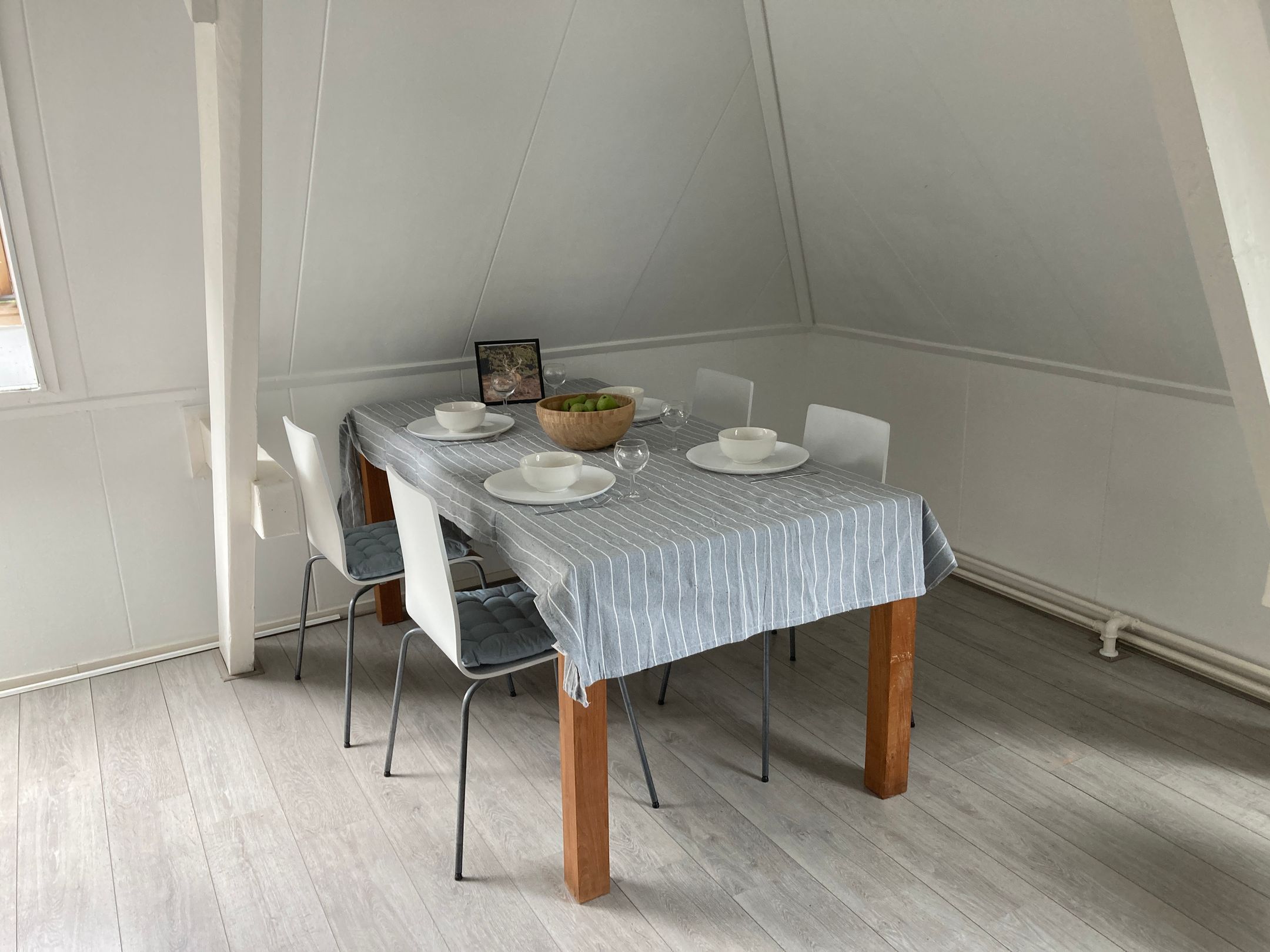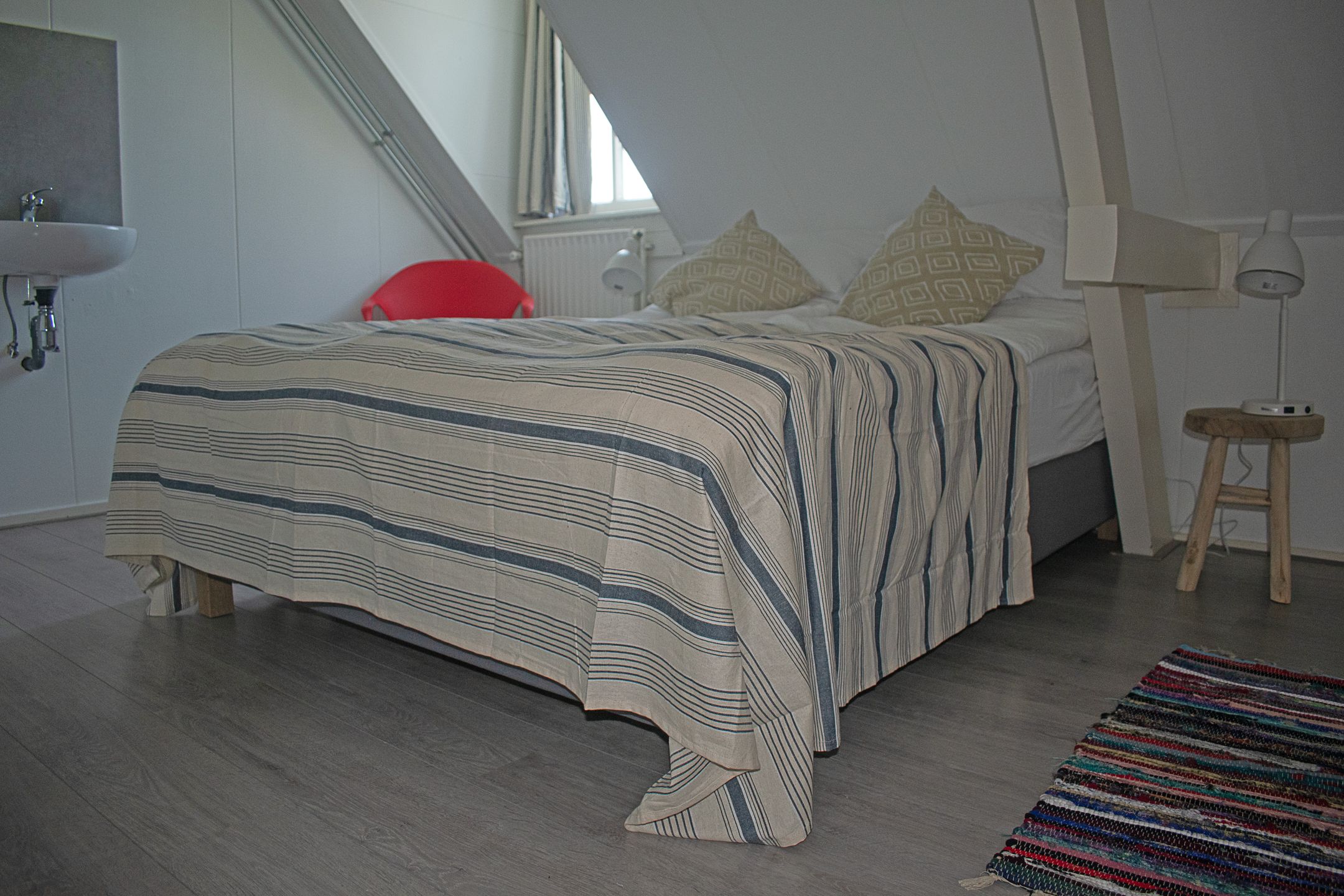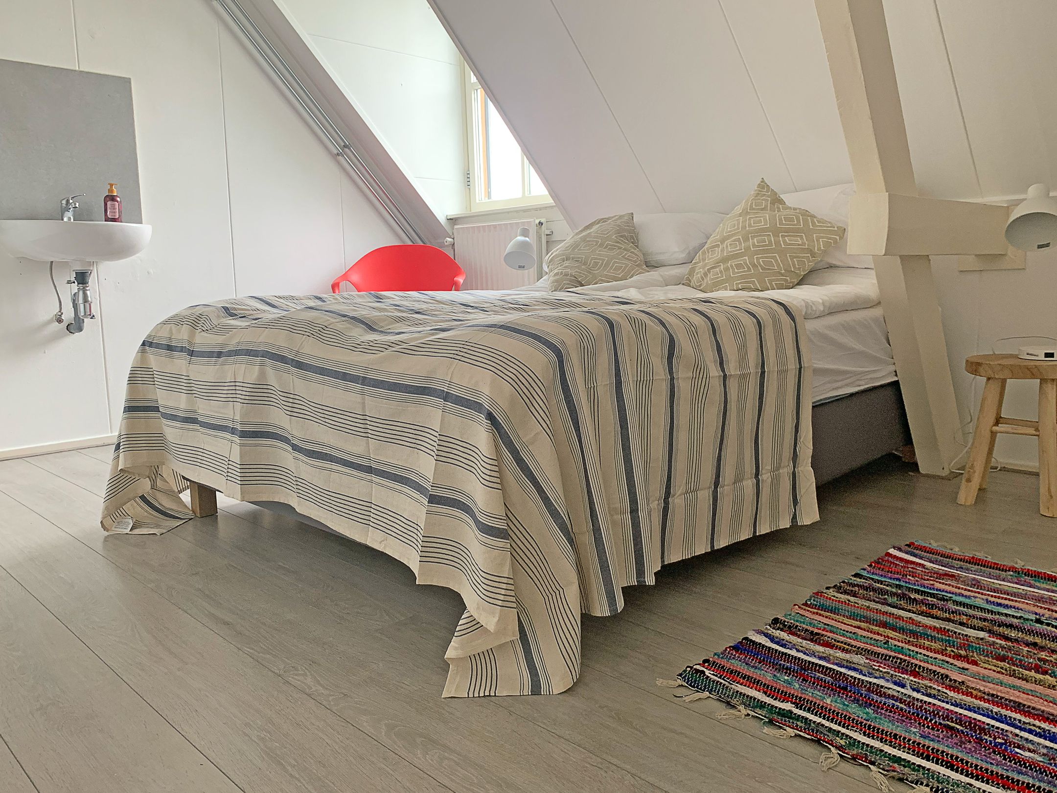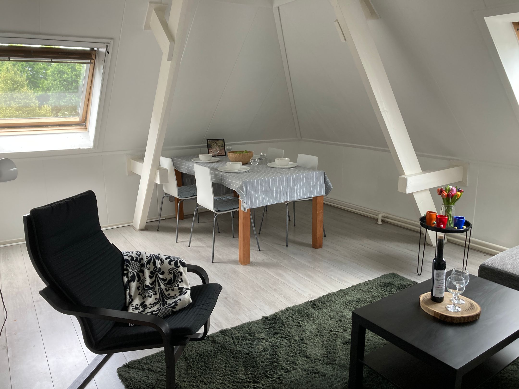 De originele spanten zijn zichtbaar en geven het geheel karakter en ritme. Geen decoratie, maar constructie die zichtbaar mag zijn.
