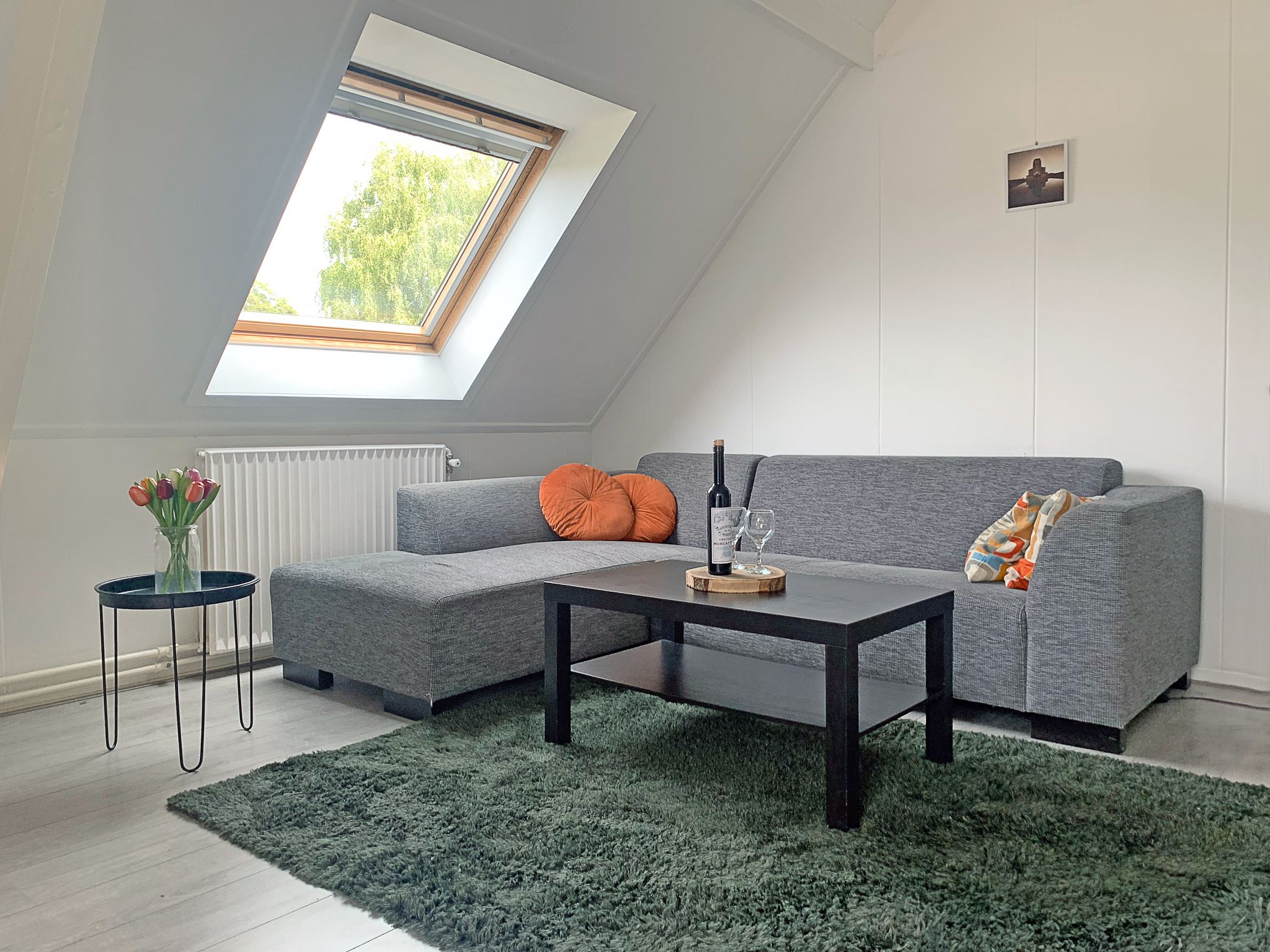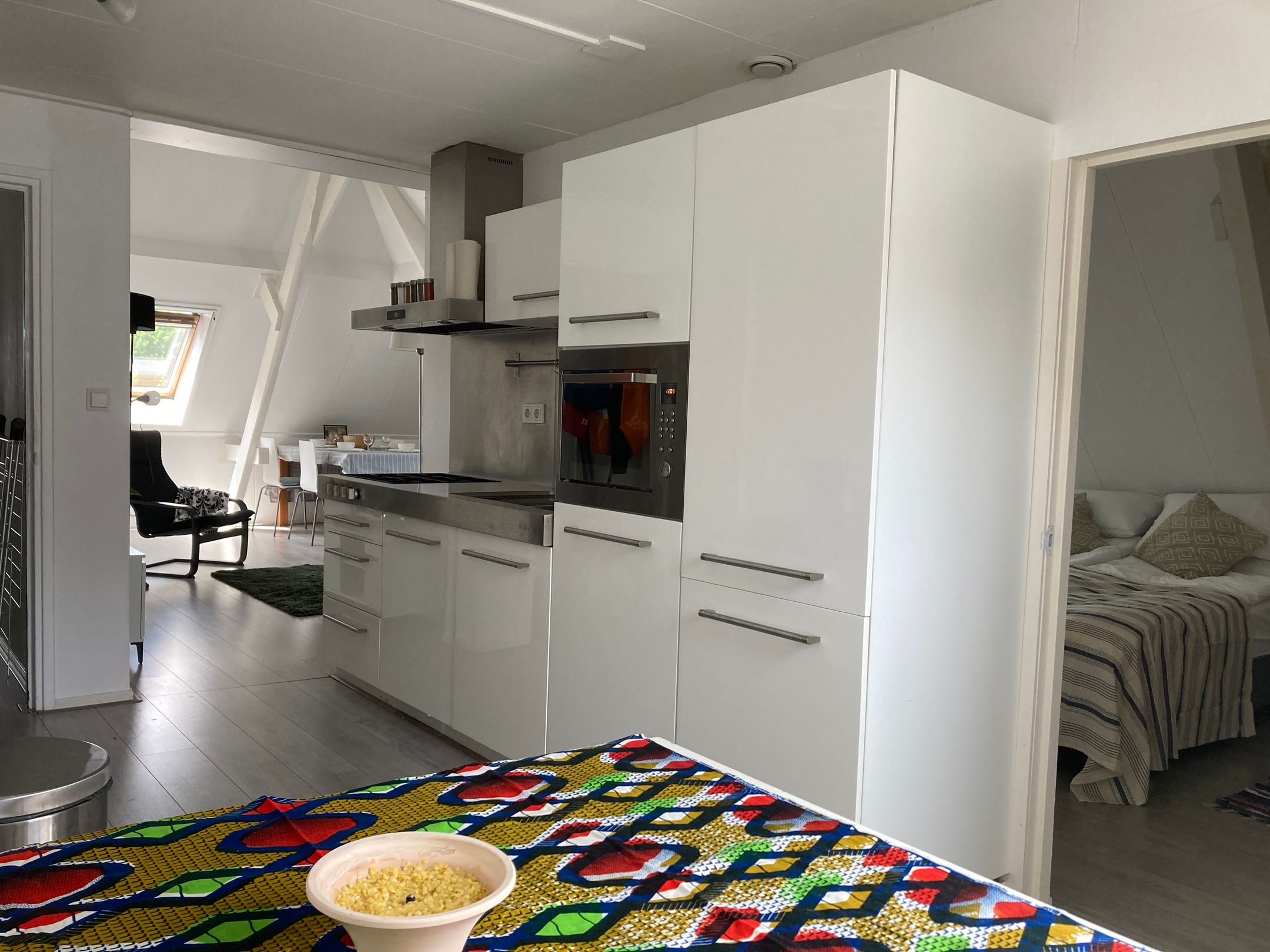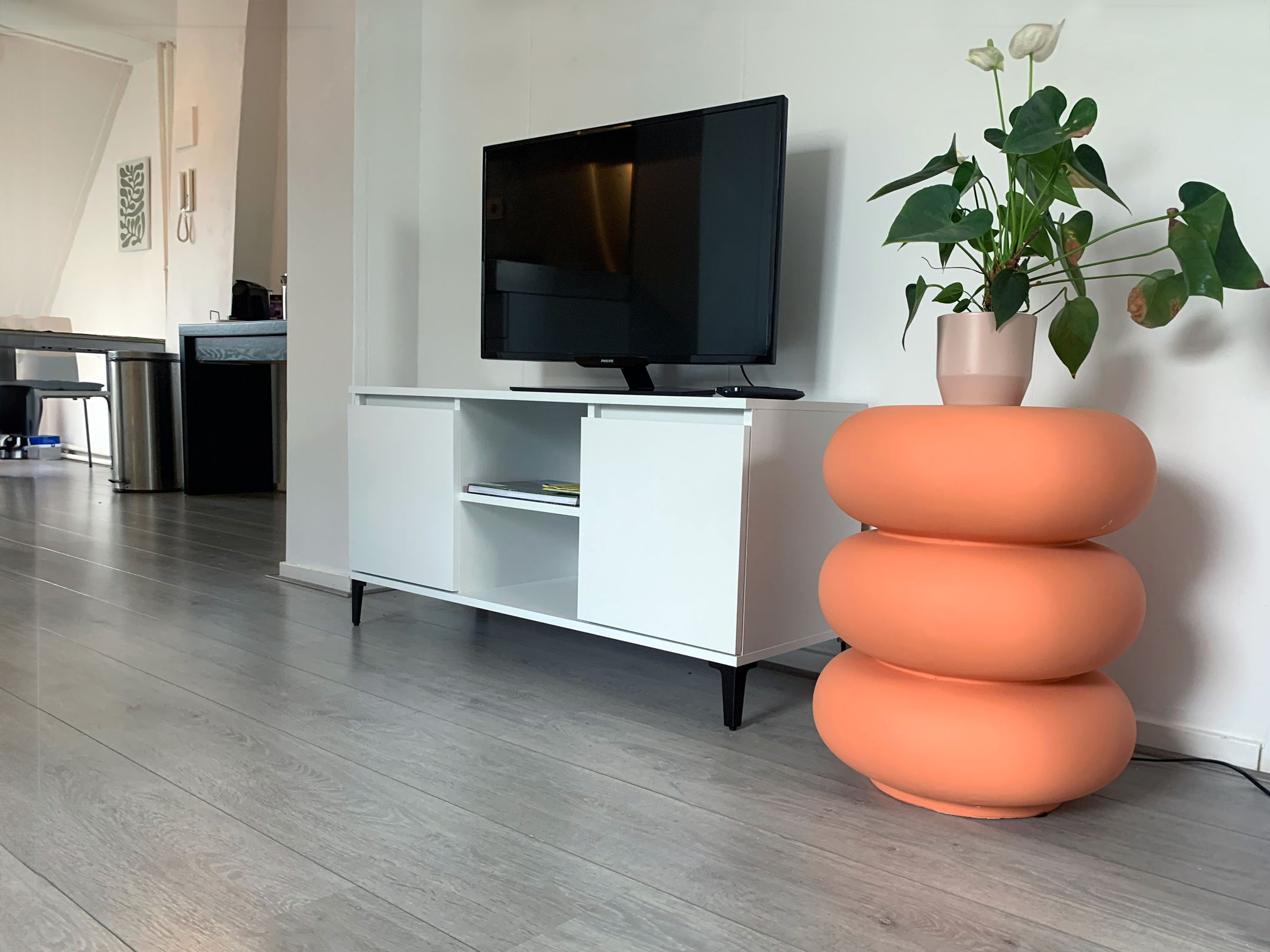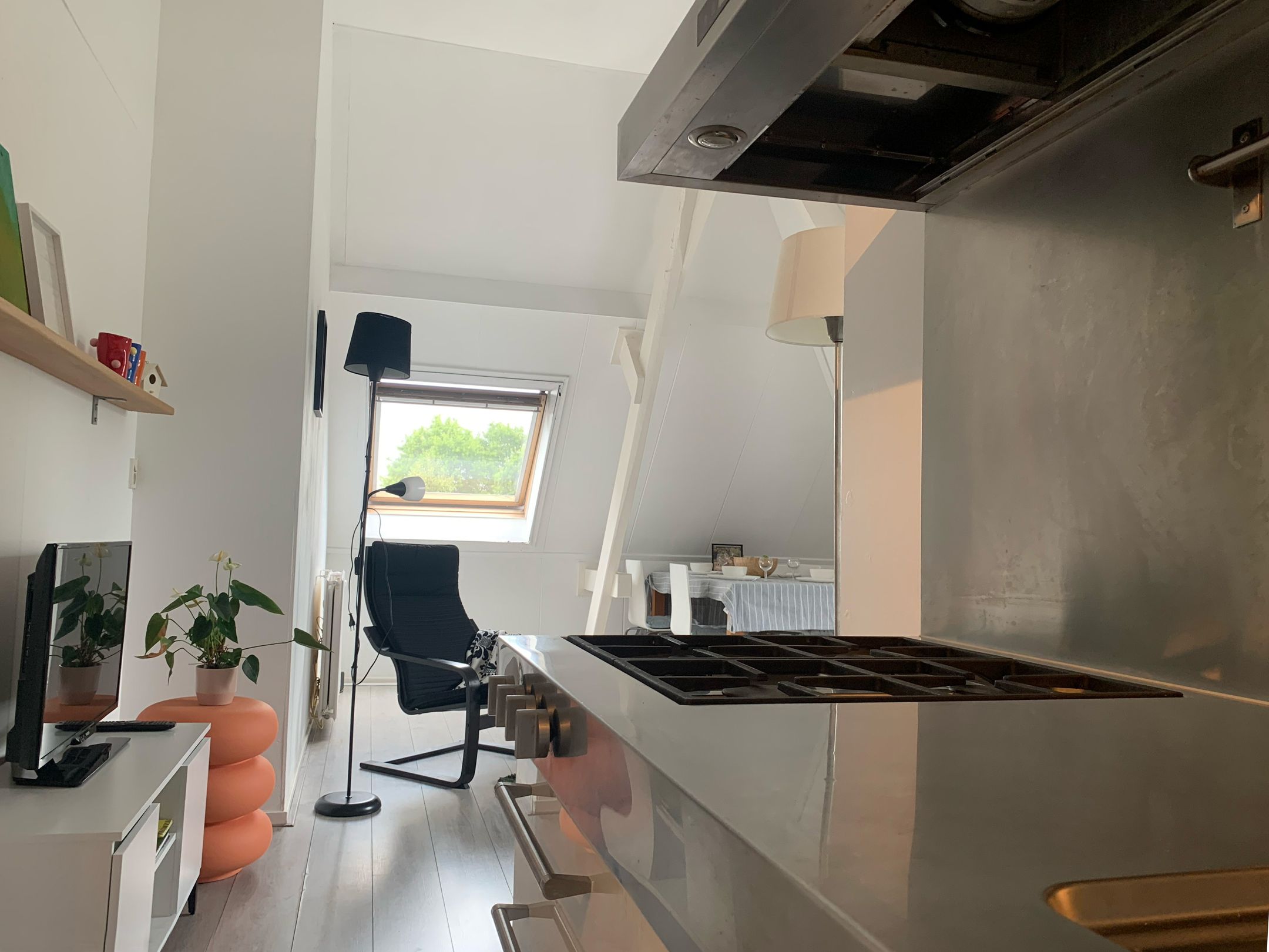 Van daaruit ontvouwt de ruimte zich richting de woonkamer en verder naar de slaapkamer.