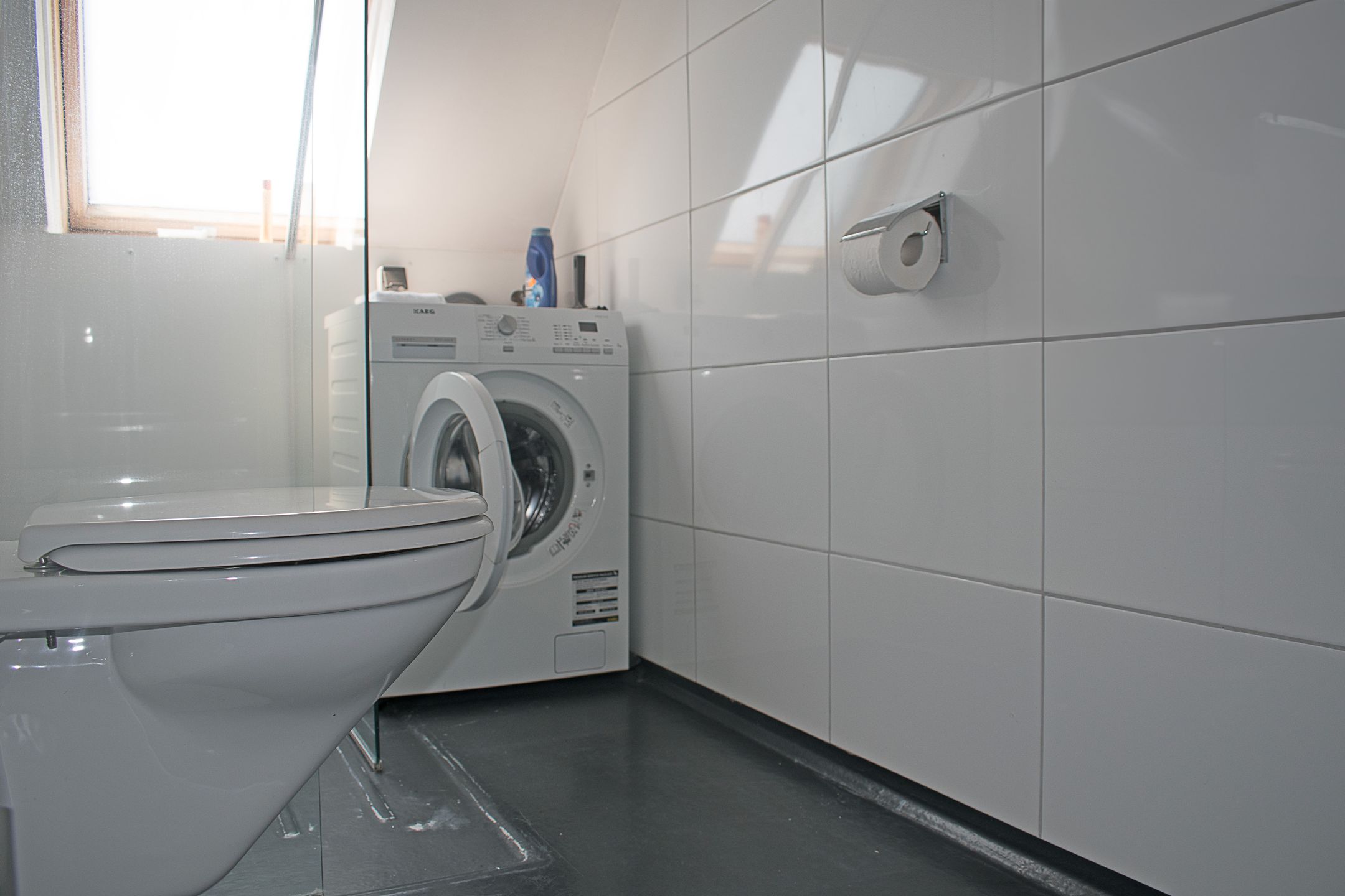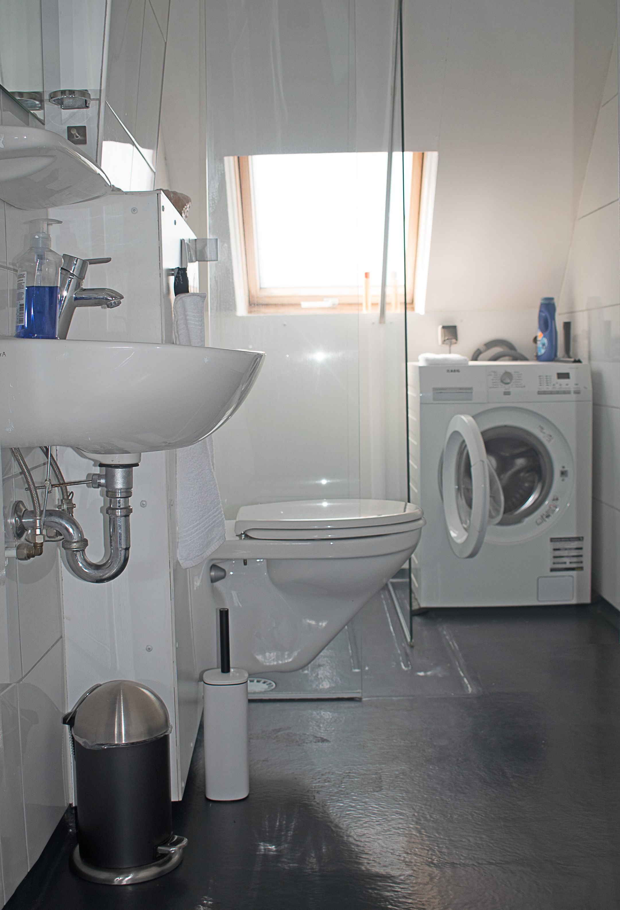 De badkamer is efficiënt gepositioneerd bij de entree, zonder dat deze de ruimtelijkheid verstoort. Alles ligt op de juiste plek, zonder dat het geforceerd voelt.