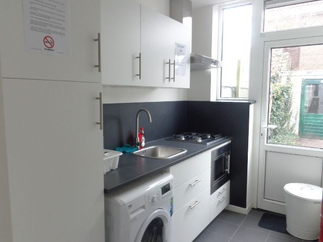 De douche, 2 toiletten en de keuken moeten gedeeld worden met 5 andere huurders. De kamer heeft een eigen wastafel.