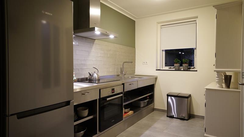 Voorzien RVS keuken met spoelbak, oven, inductie kookplaat en ruime koel-vriescombinatie.