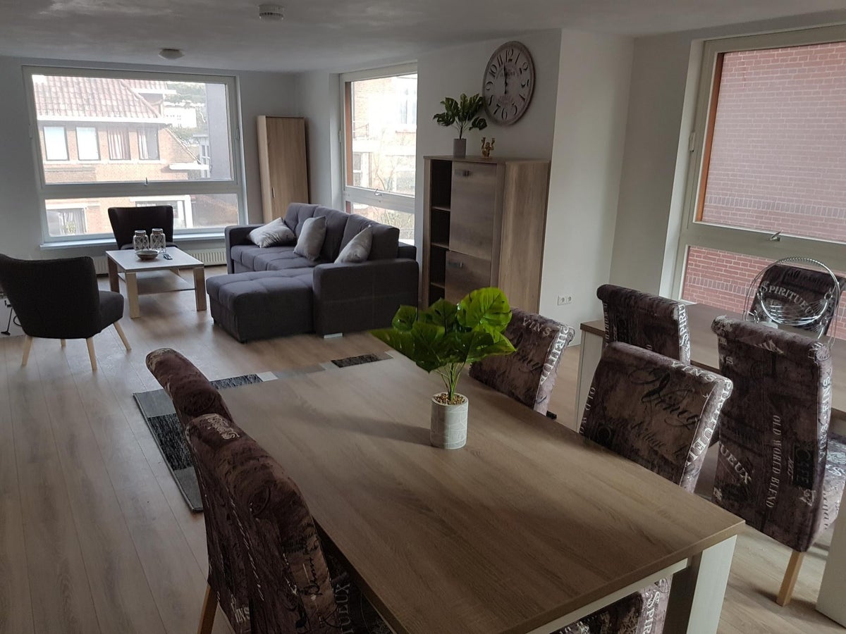 Woonkamer met balkon. Aparte keuken. De keuken is uitgerust met inbouwapparatuur (elektrische kookplaat, afzuigkap, vaatwasser, koel-vriescombi). Twee badkamers met douche, wastafel en spiegelkast.