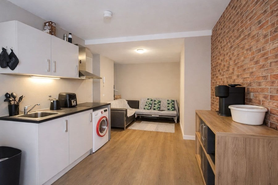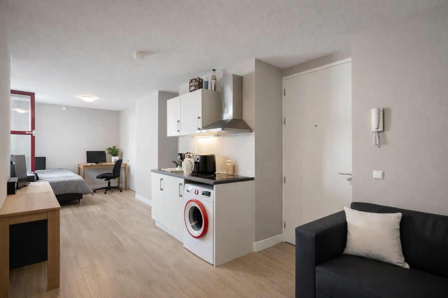 Deze studio van 28 m2 is goed in te delen en beschikt over een open keuken met afzuigkap, inductie kookplaat en koel-vries combinatie. De open badkamer bevind zich in de slaapkamer is voorzien van een inloopdouche en wastafelmeubel. Er is een apart zwevend toilet.