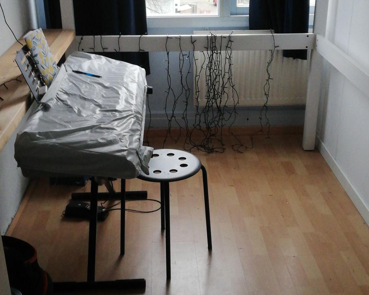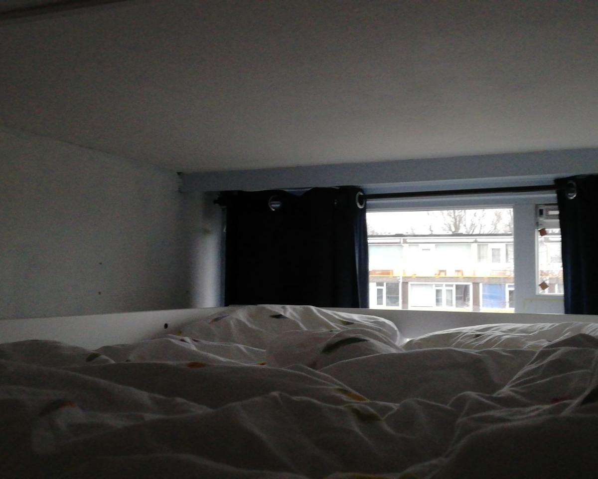 De kamer zelf is klein maar fijn. Er zit een hoog bedframe in van 1,40m bij 2m, dit zit goed vast aan de muur. Dit bed (+matras) kun je overnemen.