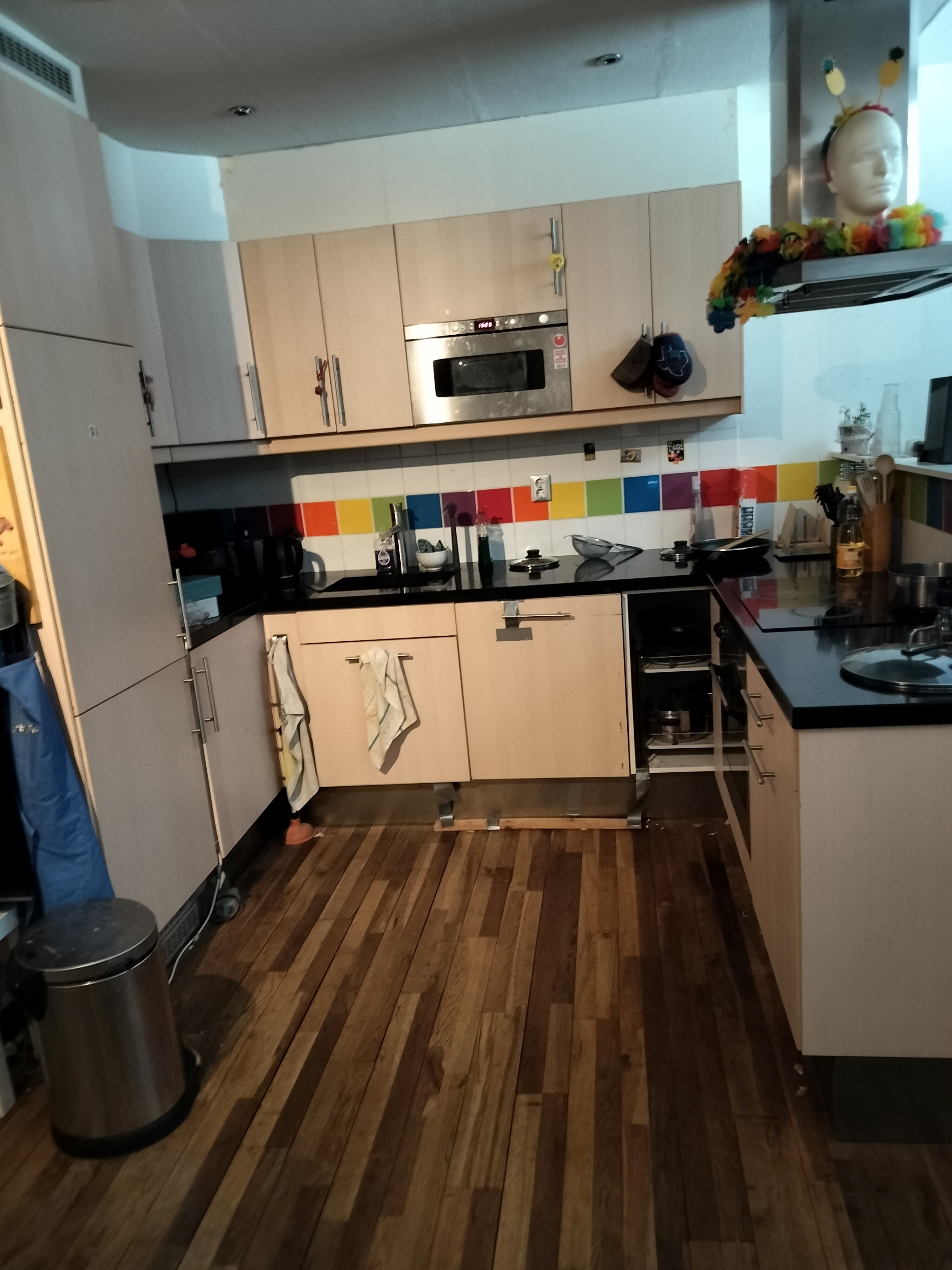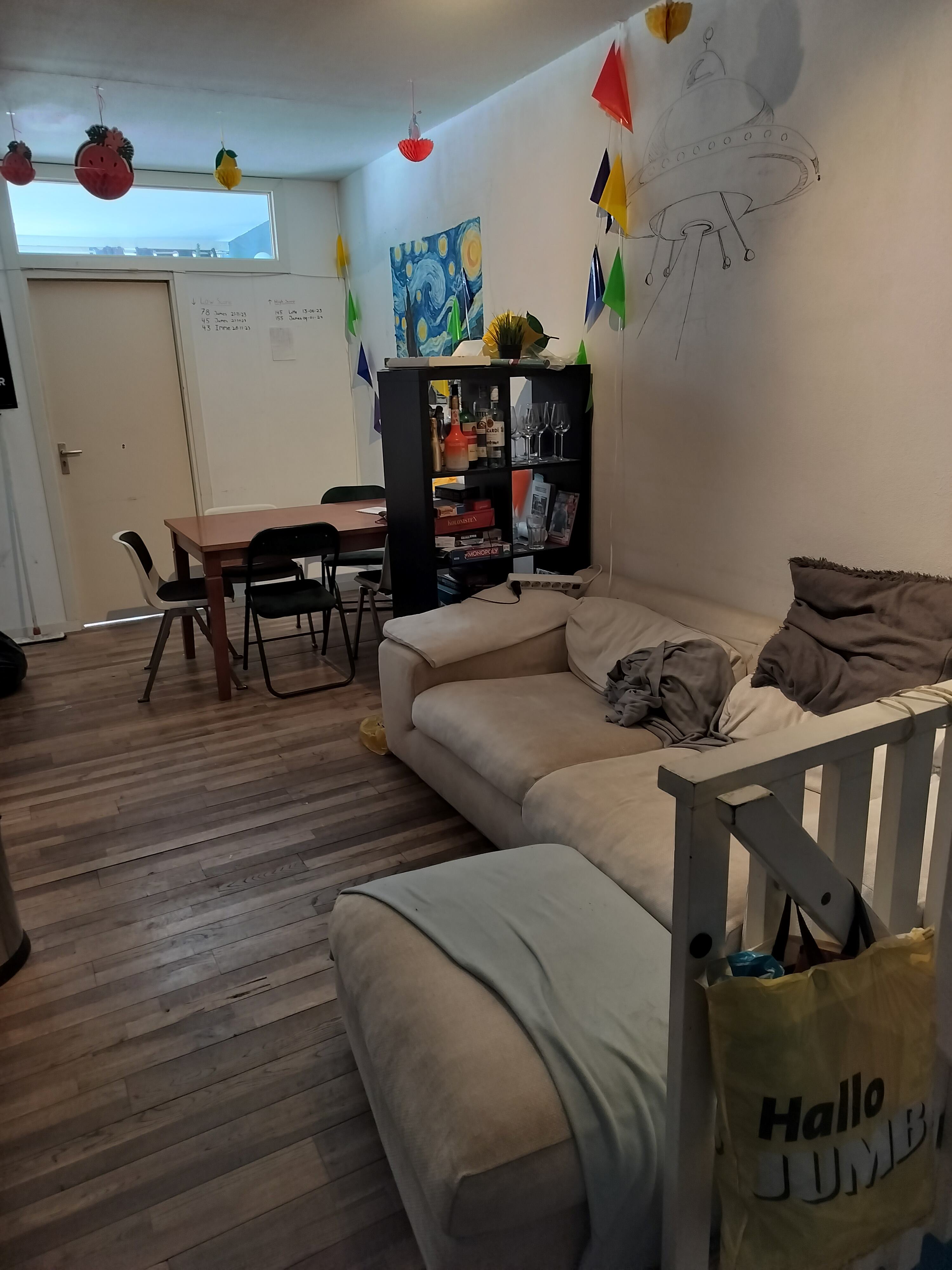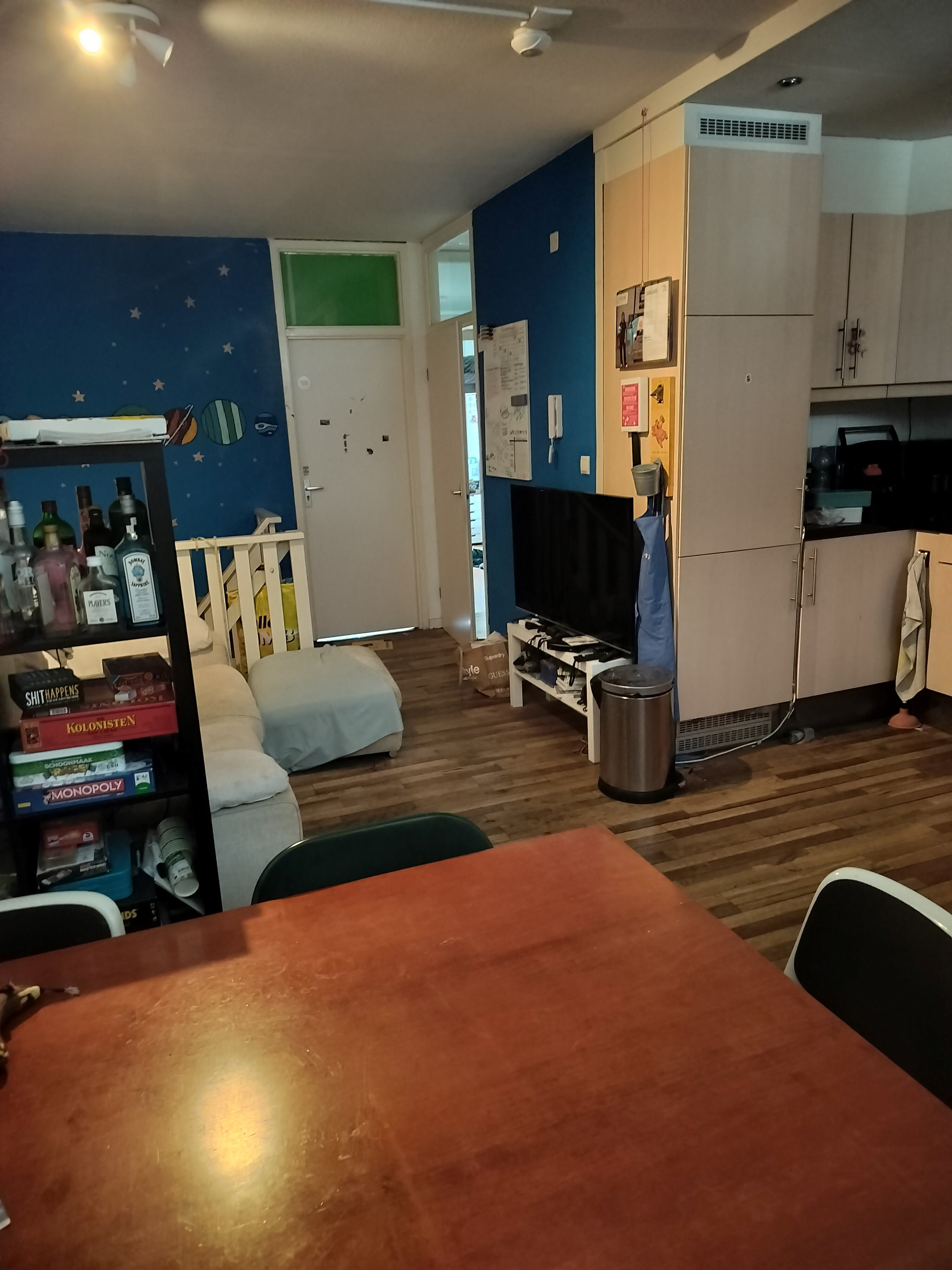 De ruimte onder het bed is ongeveer 1,70m hoog dus je houdt ruimte over voor een bureau of bankje. Buiten de kamer is er ook nog bergingsruimte in huis. Verder hebben we een chille keuken met een vaatwasser en elektrische kookplaat, een badkamer met een bad en een balkon met avondzon. Verder zijn de jumbo en de chillste ijszaak van heel Delft-Zuid op rol afstand.