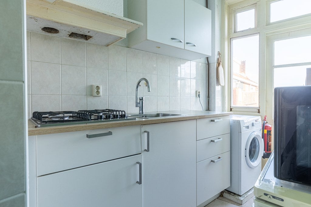 De nette, maar ook ruime keuken geeft toegang tot het balkon, is . ingericht met gaskookplaat, koelkast, magnetron en wasmachine en is voor algemeen gebruik.
