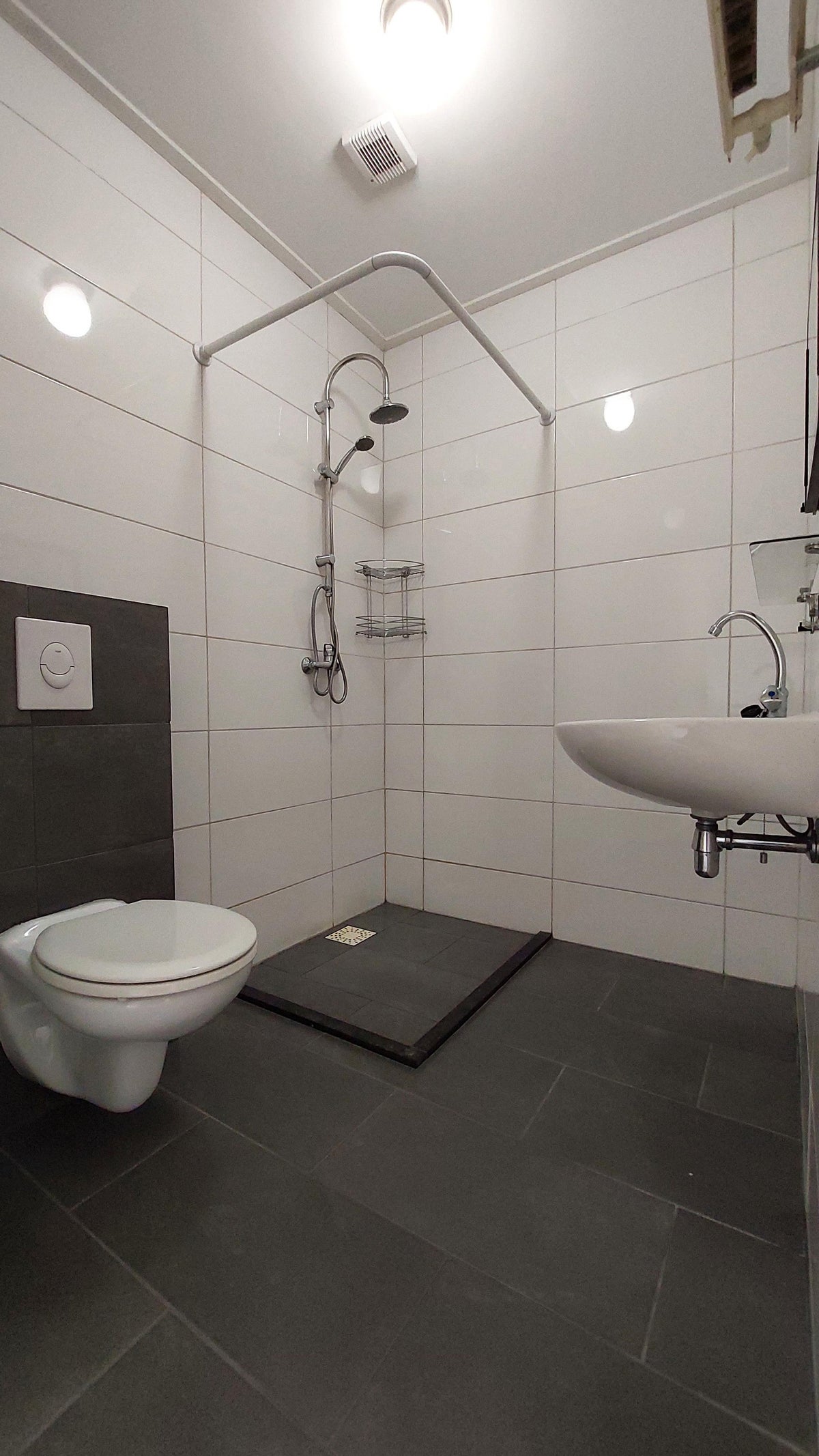 Zeer fraaie en licht betegelde badkamer met zwevend toilet, douche en wastafel.