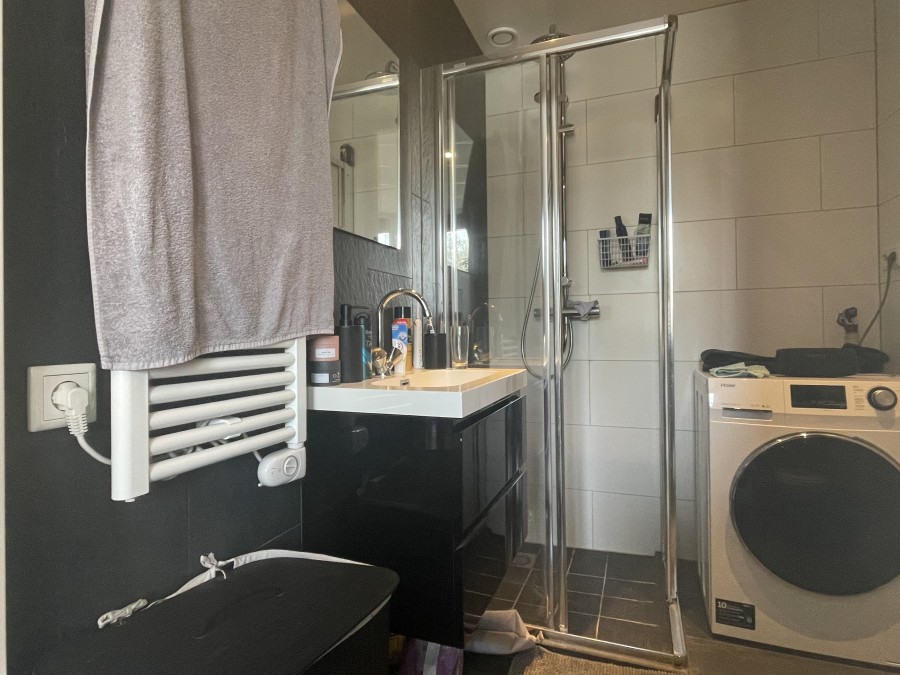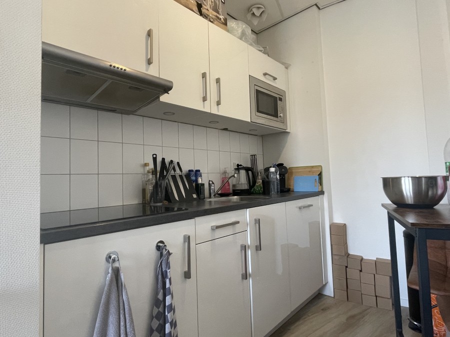 Met een slimme indeling, eigen badkamer en keuken is het een fijne plek om te wonen., Keuken, De keuken is praktisch en volledig uitgerust met een vaatwasser, koelkast met vriesvak, elektrische kookplaat, afzuigkap, magnetron en een stijlvolle hoogglans witte keuken. De ledspotjes zorgen voor prettige verlichting., Badkamer, De badkamer is compleet en modern betegeld, voorzien van een stortdouche en handdouche achter een luxe douchewand. Er is een zwevend toilet, een zwarte hoogglans wastafelkast met mengkraan en een handdoekradiator. Ook heb je hier vloerverwarming en aansluitingen voor een wasmachine en droger., Stoffering, De gehele studio is netjes afgewerkt met een luxe kunststof vloer en uitgerust met elektrische zonwering en gordijnen., Toegang, Je komt binnen via een video-intercomsysteem wat zorgt voor extra veiligheid en gemak., Deuren en ramen, De studio beschikt over draaikiepramen en een massief hardhouten voordeur., Algemene voorzieningen, Het gebouw biedt een lift, een gedeeld dakterras op de 4e etage, en een marmeren trappenhuis met designverlichting.