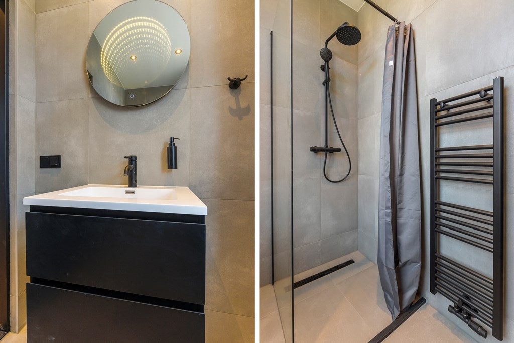 • Gerenoveerde zeer luxe badkamer met een regendouche, wastafel met kast en spiegel met geïntegreerde verlichting en ligbad;