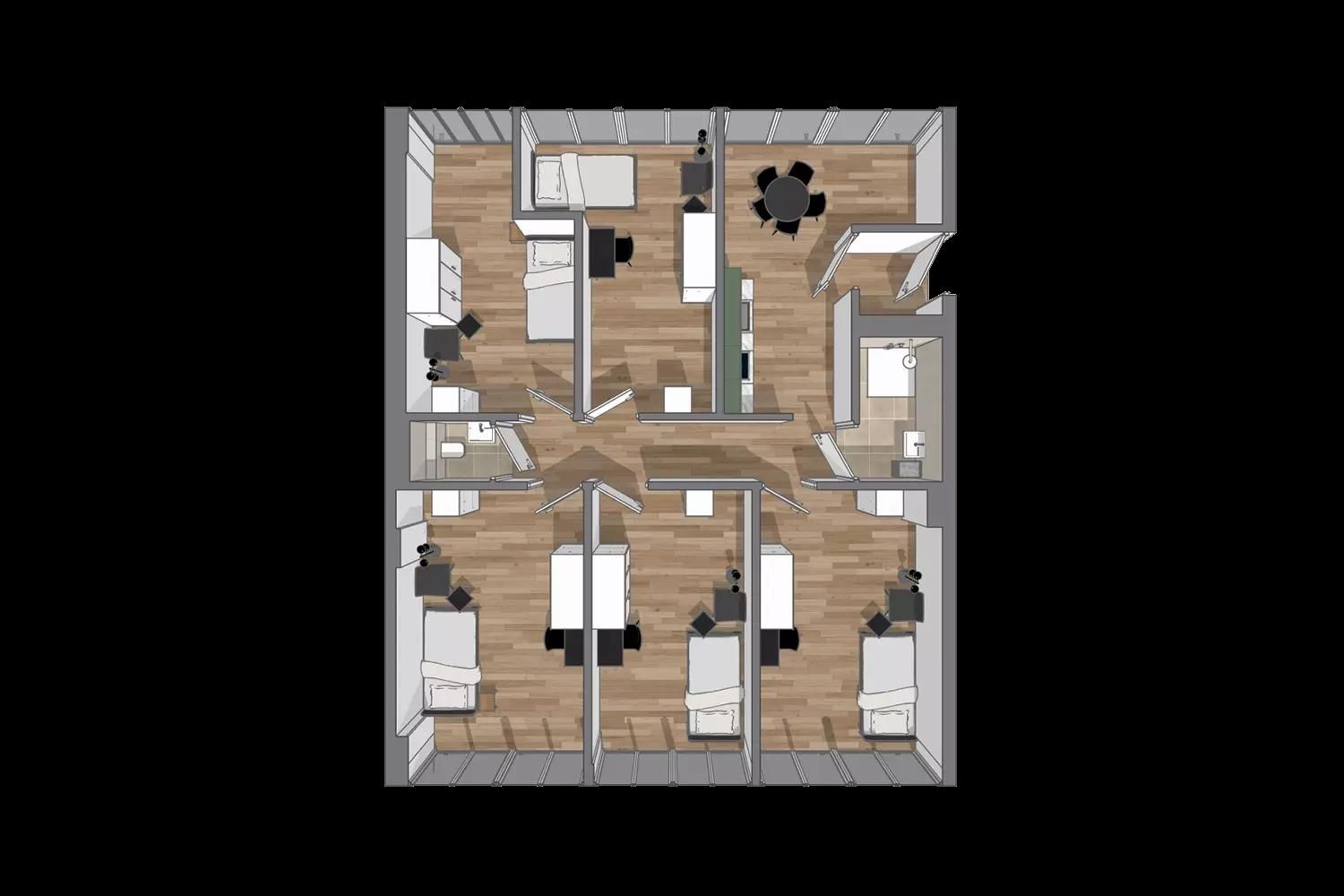Bij deze kamer in De Eendracht heb je een eigen privékamer maar deel je alle andere voorzieningen. Je eigen kamer heeft een praktische indeling. De kamer is voorzien van een PVC vloer met vloerverwarming. De kamer wordt volledig gemeubileerd opgeleverd, inclusief een fijn bed, een ruime kledingkast en voldoende opbergruimte voor al je persoonlijke spullen.