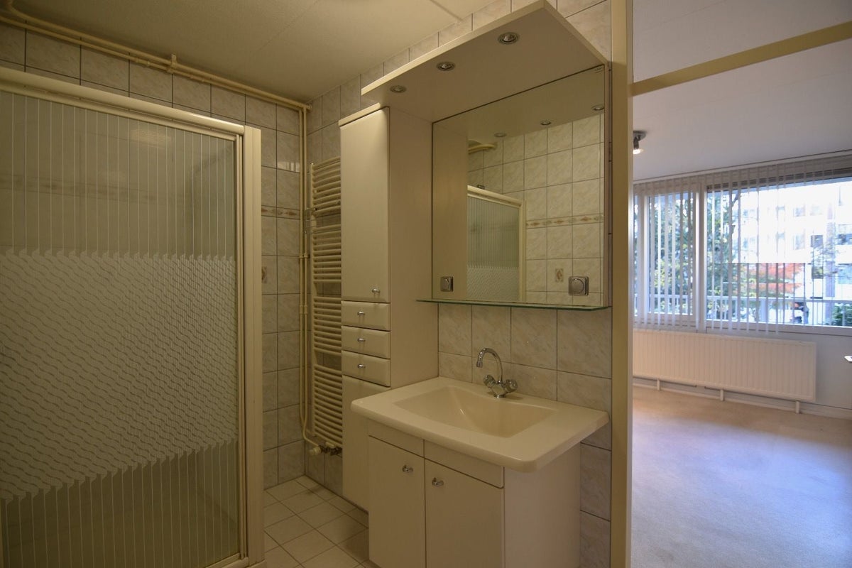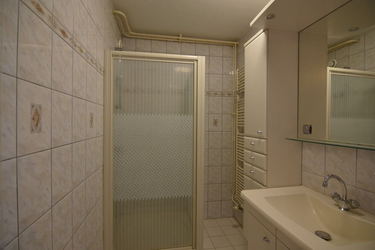 Betegelde badkamer met douche en wastafelmeubel