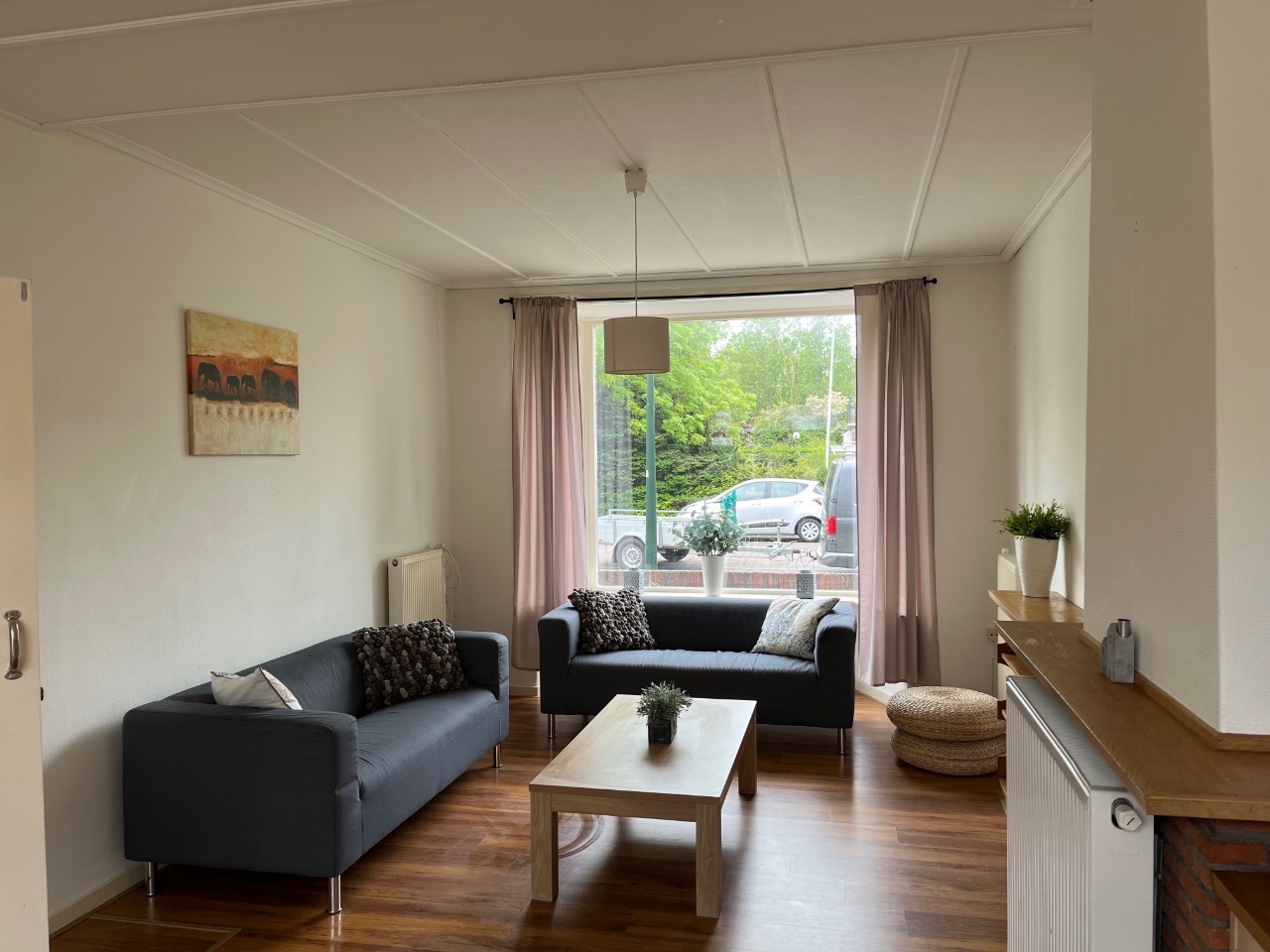 De doorzonwoonkamer heeft een erker aan de voorzijde, er ligt een parket vloer, is gemeubileerd (banken, tafel, stoelen, gordijnen).