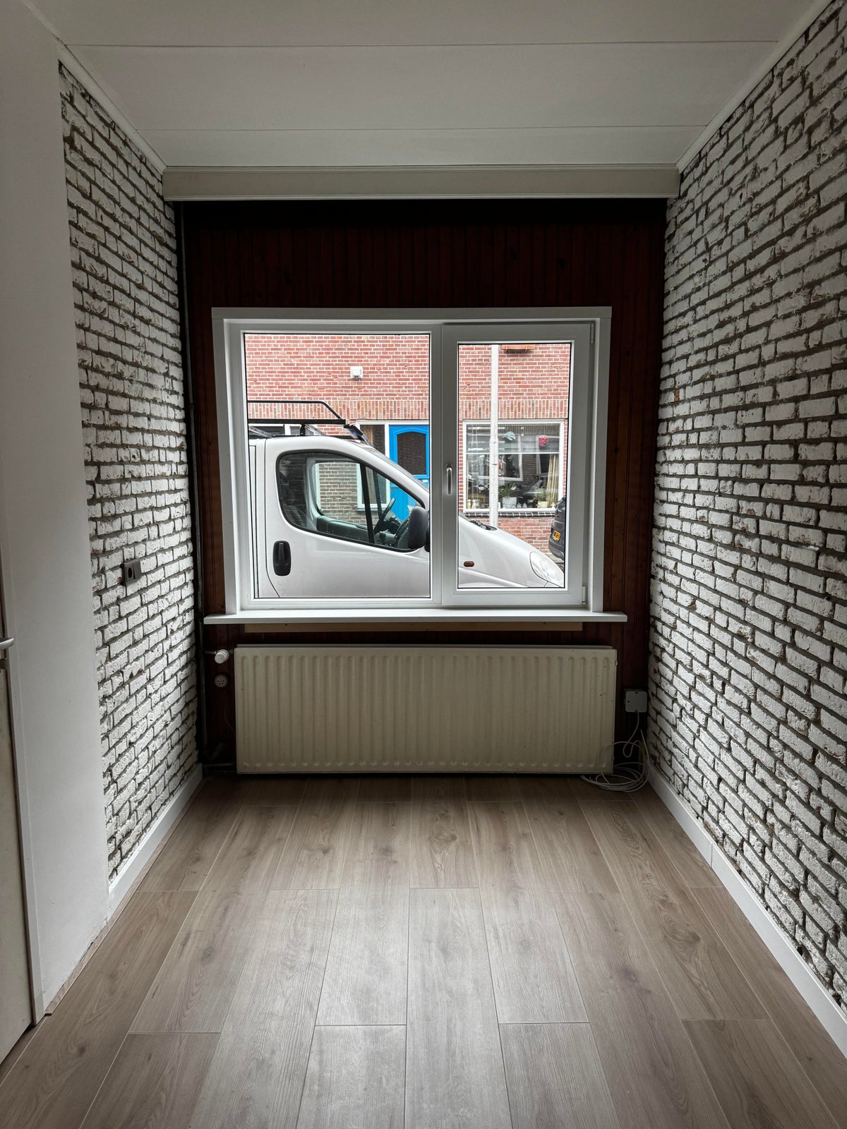 De woonkamer kan nog naar eigen inzicht gezamenlijk ingericht worden.Vanuit de woonkamer kom je in de keuken en gezamenlijke tuin met schuur. De keuken is voorzien van een nieuw keukenblok inclusief nieuwe oven met kookplaat en afzuigkap.