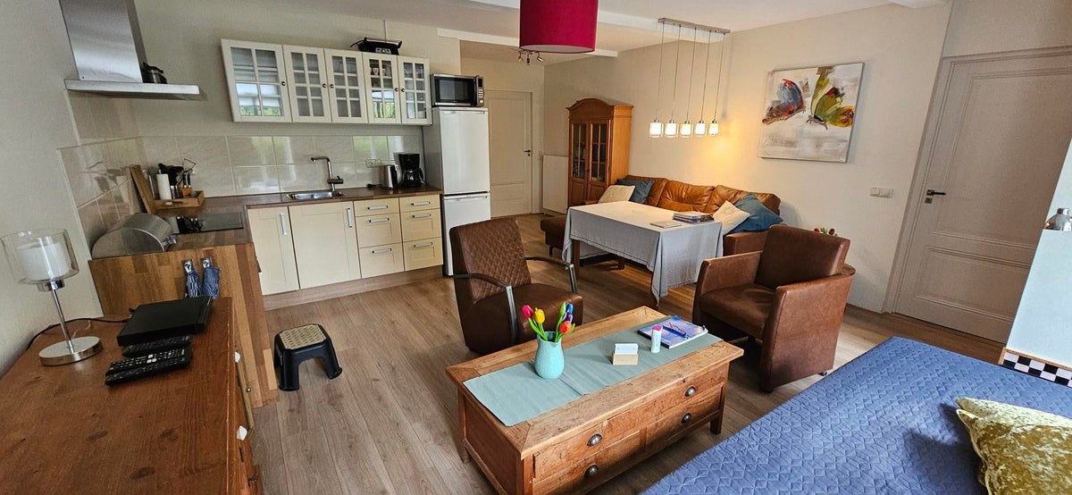 Het appartement is recent geheel gerenoveerd.De entree is gedeeld met de verhuurder en heeft direct toegang tot de ruime woonkamer met een open keuken. De keuken is voorzien van (inbouw)apparatuur, waaronder een inductiekookplaat, afzuigkap, combimagnetron, koelkast en vriezer.