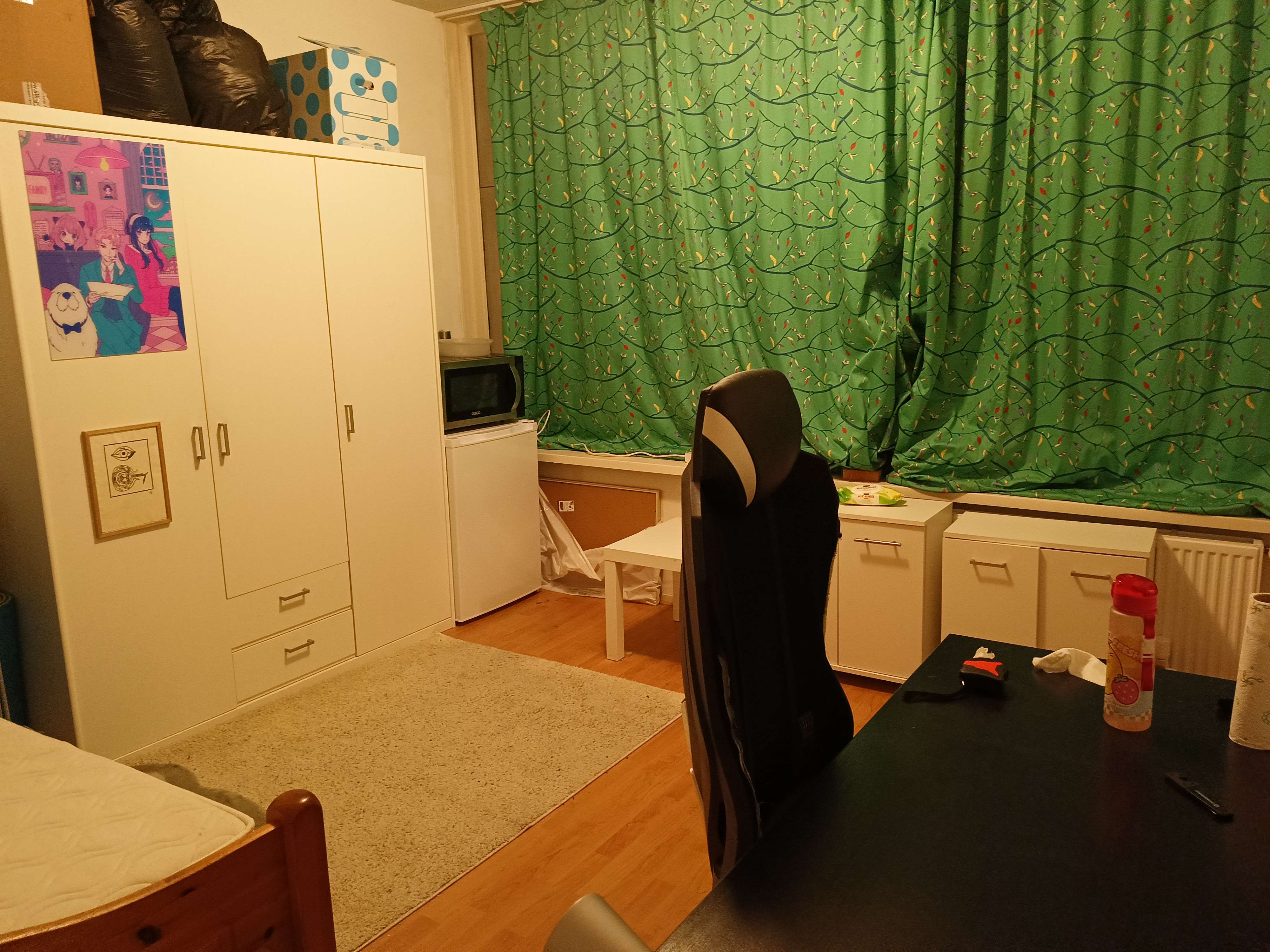 The house itself is kept in relatively good state by 5 other tenants, all except 1 being students, and 1 of them being CMGT student.## Details:- Price: 590€/month in total- Tenants: 6 in total- Period: Now - July (negotiable)- Room size: ~16m²- Furnished: Yes (no fee for furnitures)## Comodities:- 2 toilets (a blessing if you're used to sharing one)- shared oven- fenced outdoor area- shed for storage bicycles- personal microwave in the room- personal fridge in the room- fast ethernet connection