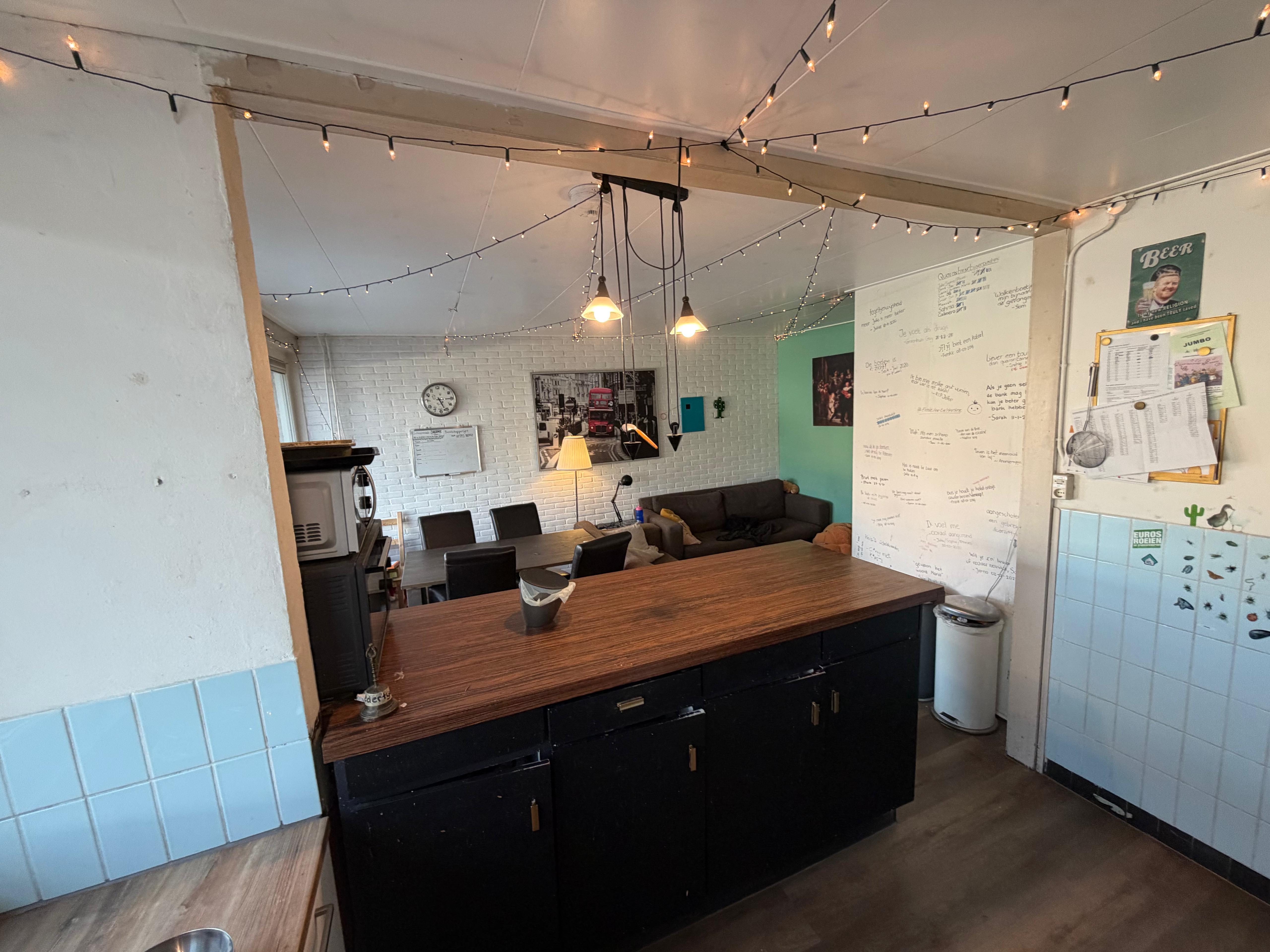 Het huis beschikt over twee badkamers, twee toiletten en een grote woonkamer met open keuken. Daarnaast hebben we EEN ENORM DAKTERRAS :). Ook aanwezig is een koelkast, vriezer, droger en wasmachine.Iedereen in ons huis doet verschillende studies en is op zijn/haar eigen manier actief in het studentenleven. Hierdoor is ons huis erg divers, wat erg leuk is! Ondanks dat iedereen erg druk is, proberen we zo vaak mogelijk samen te eten met de mensen die thuis zijn.