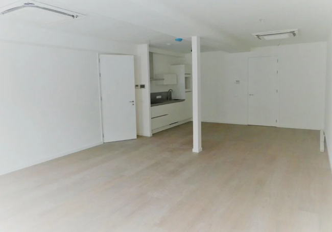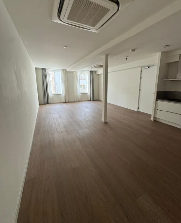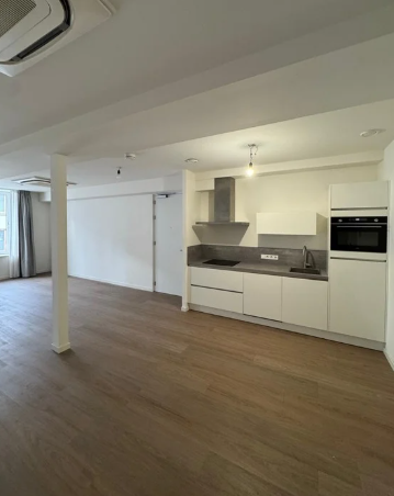 Grote leefruimte, 45 m2 (circa 9.00 x 5.00 m). Badkamer, 4,4 m2 (4.90 x 1.50). De badkamer heeft een installatie kast met schuifdeuren waar achter zich de warmtepomp en de aansluiting voor de wasmachine zich bevinden.Voorzijde: Grote raampartij met uitzicht op de Voorstad..