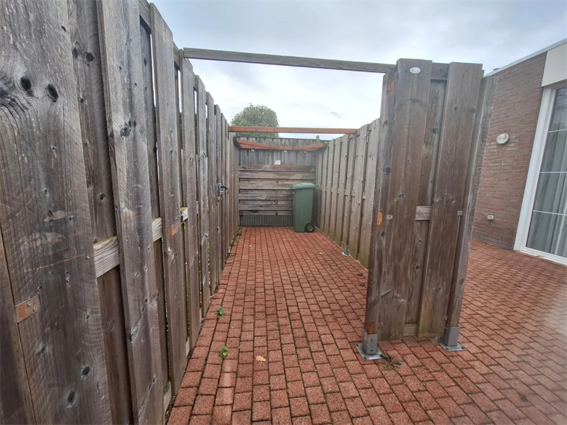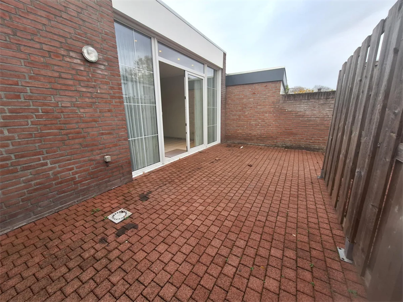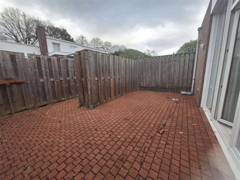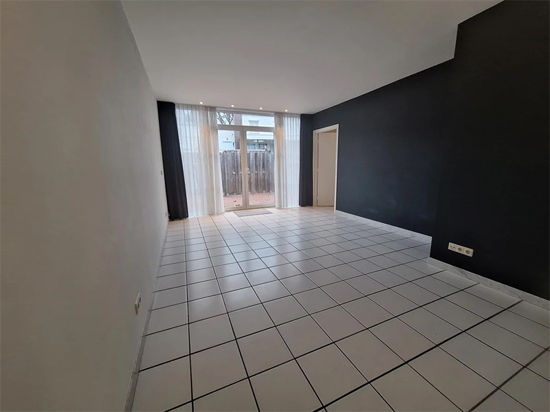 De schuifpui opent naar de gedeelde tuin en fietsenstalling, die je samen met de andere bewoners gebruikt..