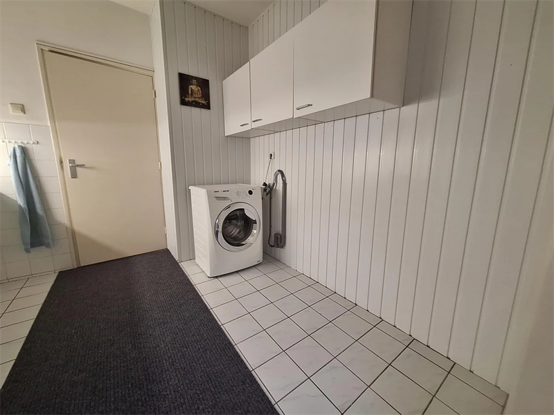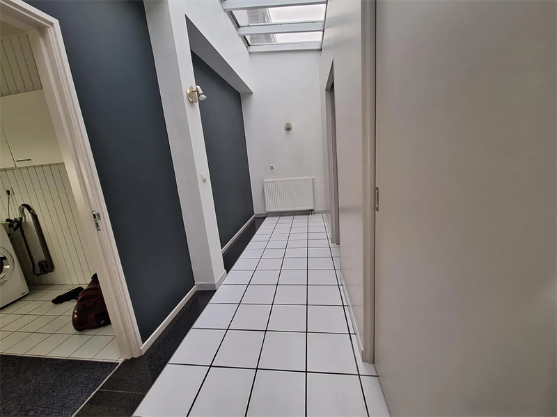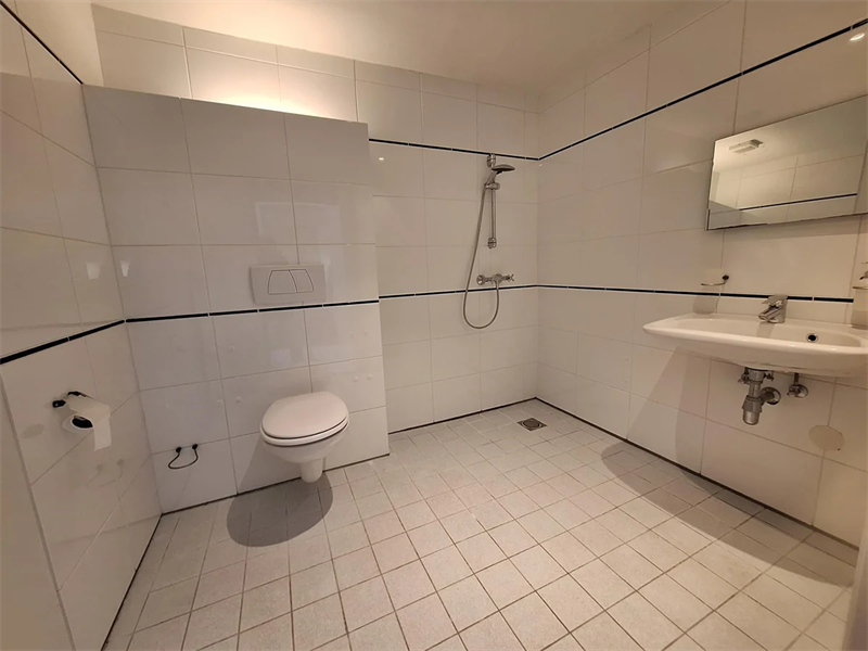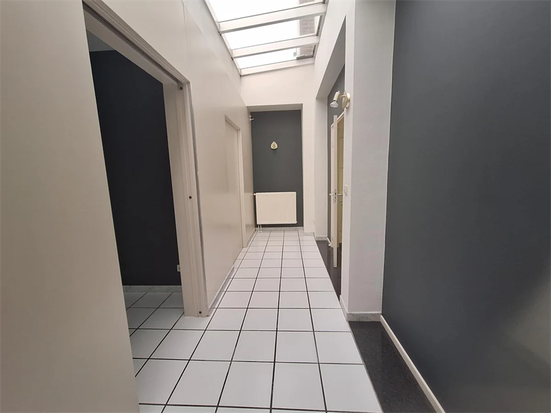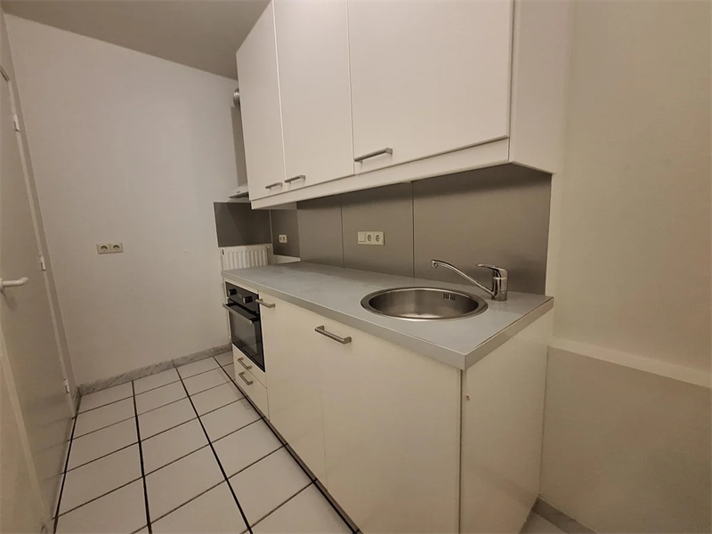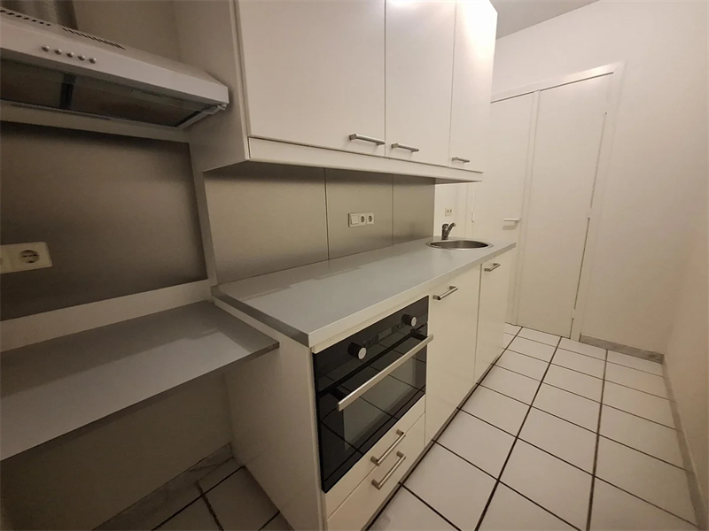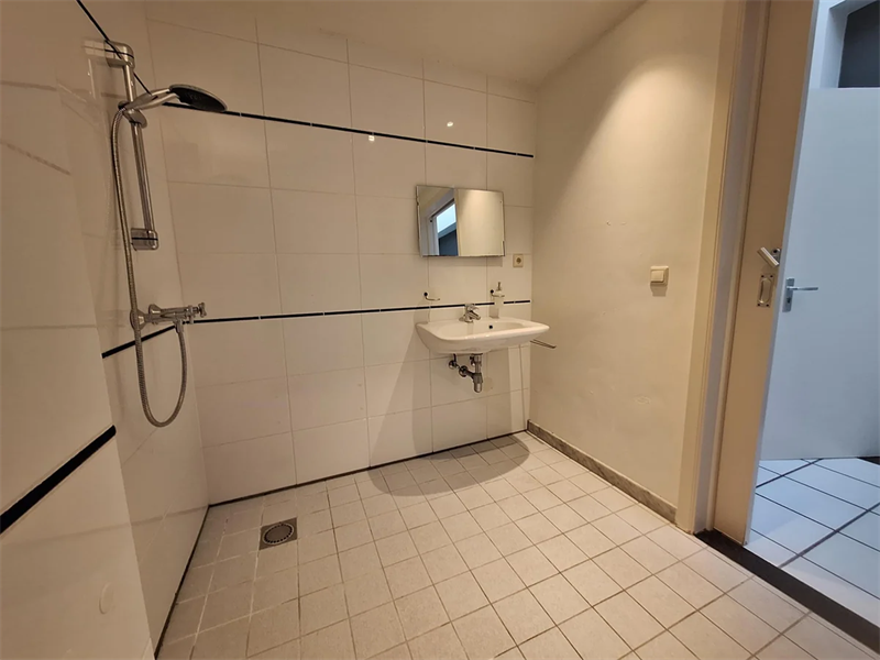 Via de gezamenlijke keuken stap je direct de ruime hal van de studio binnen. Vanuit deze hal bereik je de grote badkamer, uitgerust met toilet, douche en wastafel. De andere deur leidt je naar het lichte woon- en slaapgedeelte, waar de grote ramen voor een fijne natuurlijke lichtinval zorgen. De afgesloten keuken is praktisch ingericht met een wasbak, oven, afzuigkap en veel opbergruimte.