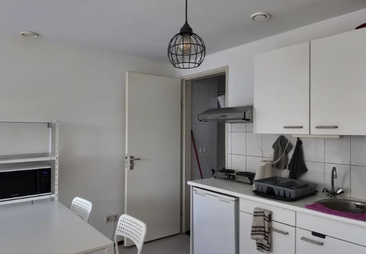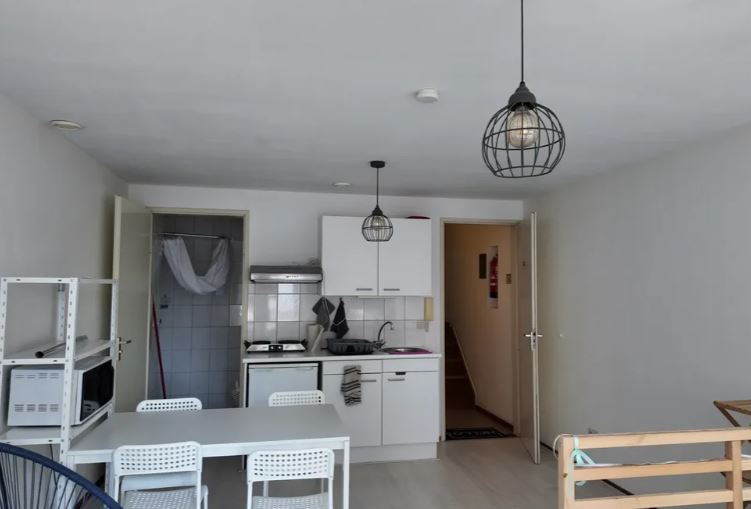 Studio gelegen op de 2de etage bestaande uit een woon/slaapkamer (22 m²) met open keuken en een badkamer met douche, wastafel en toilet.