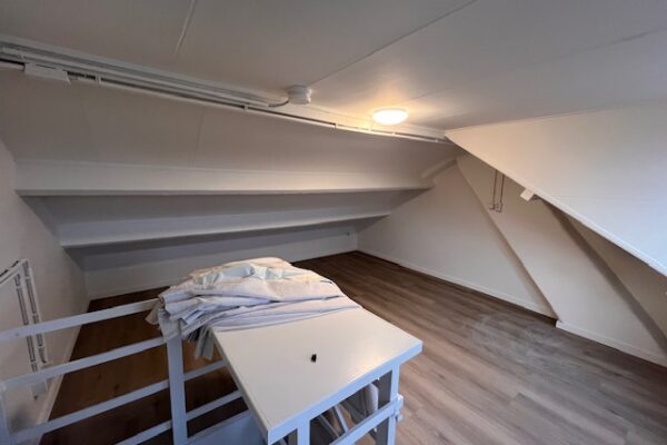 De kamer bevind zicht op de 2e verdieping van het pand op zolder. De badkamer en toiletruimte deel je met 2 andere huisgenoten. De keuken bevind zicht op de begane grond verdieping van de woning en deze deel je met 5 anderen. De keuken is compleet gerenoveerd en beschikt over een inbouw koelkast.