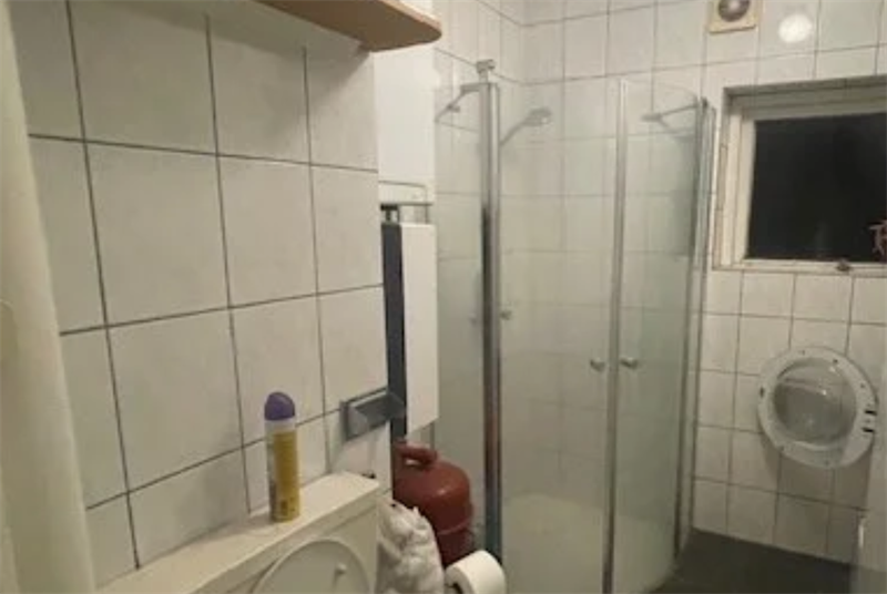 Daarnaast bevindt zich op de eerste verdieping de gedeelde badkamer, waar ook het toilet aanwezig is. Kamer 2 (foto 7 t/m 10) heeft een woonoppervlakte van ca. 23 m2 en bevindt zich op de eerste verdieping. De kamer beschikt ook over een eigen keuken en biedt daarnaast toegang tot een ruim privé dakterras.