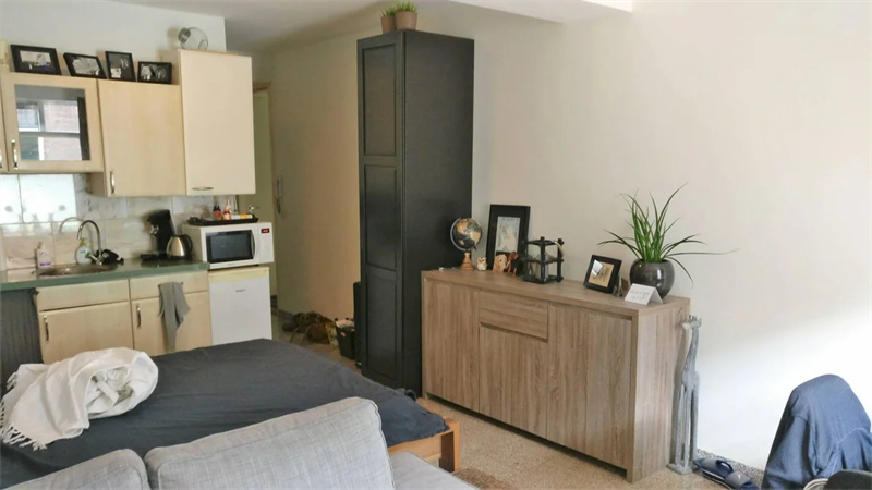 Een ideale woonruimte voor een jonge man of vrouw die alles uit het leven haalt en een comfortabel thuis wenst. De studio heeft een oppervlakte van ongeveer 35 m² (wonen en slapen in dezelfde ruimte). De badkamer is degelijk afgewerkt met graniet en een was- en droogruimte is centraal geregeld binnen het complex. Er is een gecombineerde centrale opslag voor afval en rijwielen.
