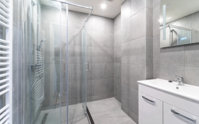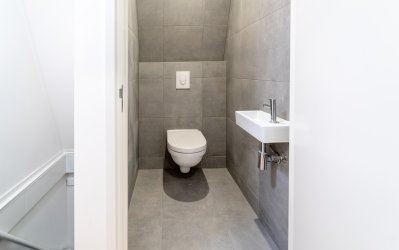 De badkamer is zeer luxe afgewerkt en voorzien een douche, wasbak en designradiator..
