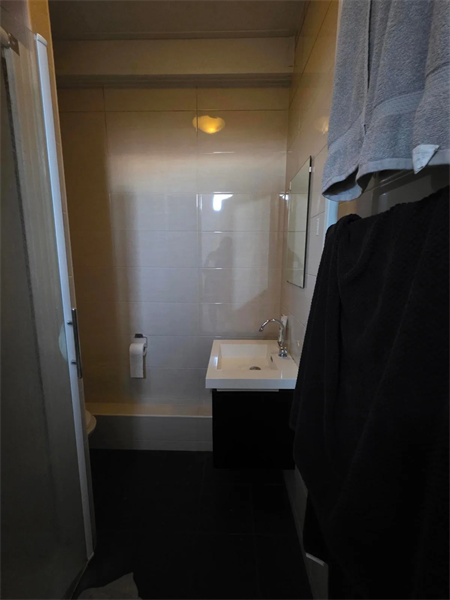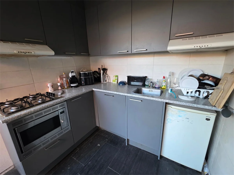 De keuken is uitgerust met een inbouwafzuigkap, gasfornuis en een combi-oven/magnetron. Daarnaast is er een gemeenschappelijke woonkamer van circa 30 m². De woning beschikt over twee badkamers met douche en wastafel en drie toiletten. Alle voorzieningen worden gedeeld met zes andere huisgenoten.