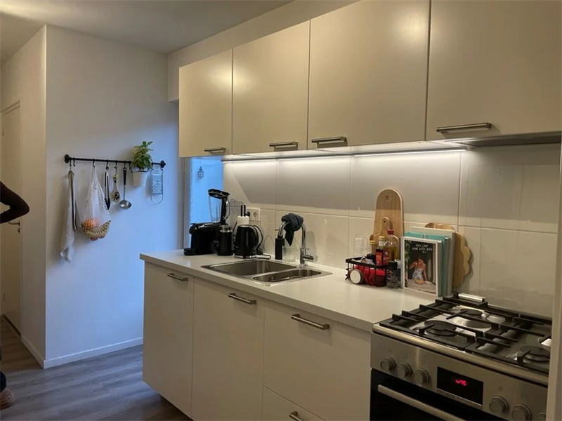 De woonkamer is voorzien van vloerbedekking en geeft toegang tot de keuken. De keuken is voorzien van een 6-pits gasfornuis en afzuigkap. De badkamer is voorzien van een inloopdouche en een wastafelmeubel met spiegel. Twee slaapkamers die zijn voorzien van vloerbedekking.