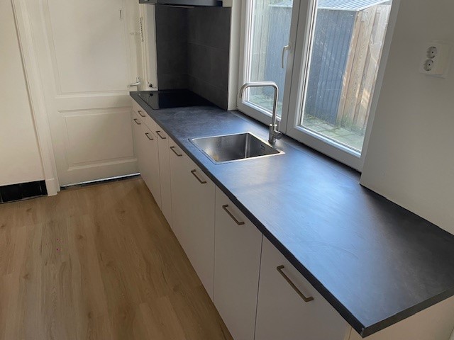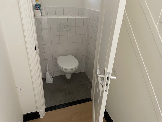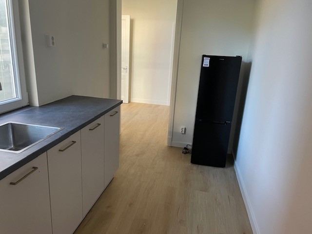 Omschrijving: De woning beschikt over een gemeenschappelijke keuken en woonkamer. De splinternieuwe keuken wordt gedeeld met drie andere bewoners. De keuken is voorzien van een koelkast met vriesvak, elektrische kookplaat en afzuiging. Op de begane grond is tevens het toilet aanwezig.