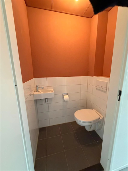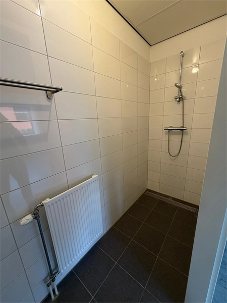 De badkamer is volledig betegeld en uitgevoerd met een douche en wastafelmeubel en apart toilet..