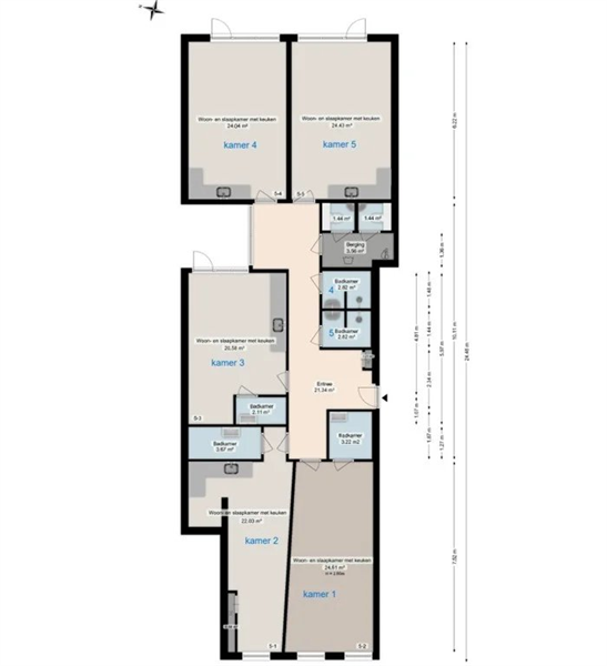 Bij binnenkomst in de woning kom je eerst in de hal, die toegang geeft tot de gemeenschappelijke toiletten en alle kamers. De gerenoveerde kamers hebben gemiddeld een oppervlakte van 20 m² en hebben allemaal een eigen badkamer en keuken, voorzien van een inductiekookplaat, afzuigkap, koelkast en een combinatie oven/magnetron. Tevens beschikken drie kamers over een eigen tuin.Huurprijs en borg De huurprijs van kamer 1 bedraagt €895,- per maand inclusief een voorschot van €75,- op gas, water, elektra, televisie en internet. De huurprijs van kamer 2 bedraagt €895,- per maand inclusief een voorschot van €75,- op gas, water, elektra, televisie en internet.