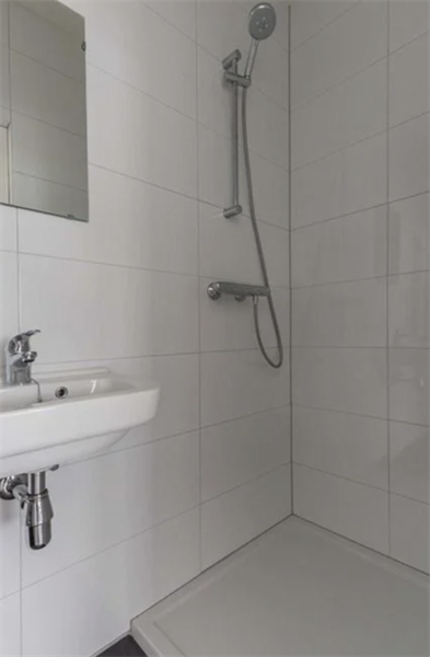 Betegelde moderne badkamer met wastafelmeubel, douche en hangend toilet. Voorzien van een PVC-laminaat vloer met als groot voordeel dat het stiller en warmer is dan gewone laminaat; aansluiting voor een wasmachine is beschikbaar; eigen deurbel met intercomsysteem;.