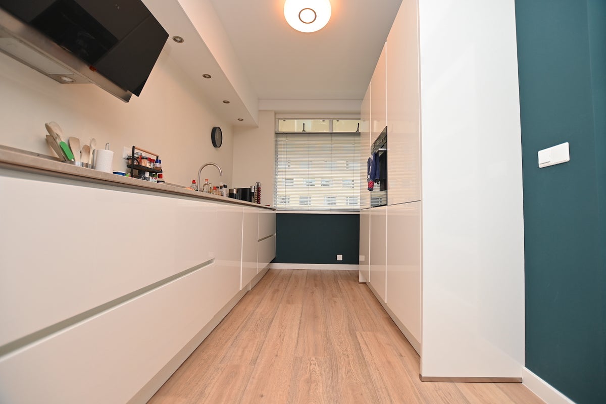 Via de galerij heeft u een uitzicht over de stad. Bij binnenkomst in het appartement komen we in de ruime hal waar aan de rechterzijde de woonkamer met open keuken zich bevindt. De luxe keuken is voorzien van . een inductie kookplaat, vaatwasser, koelkast en vriezer.