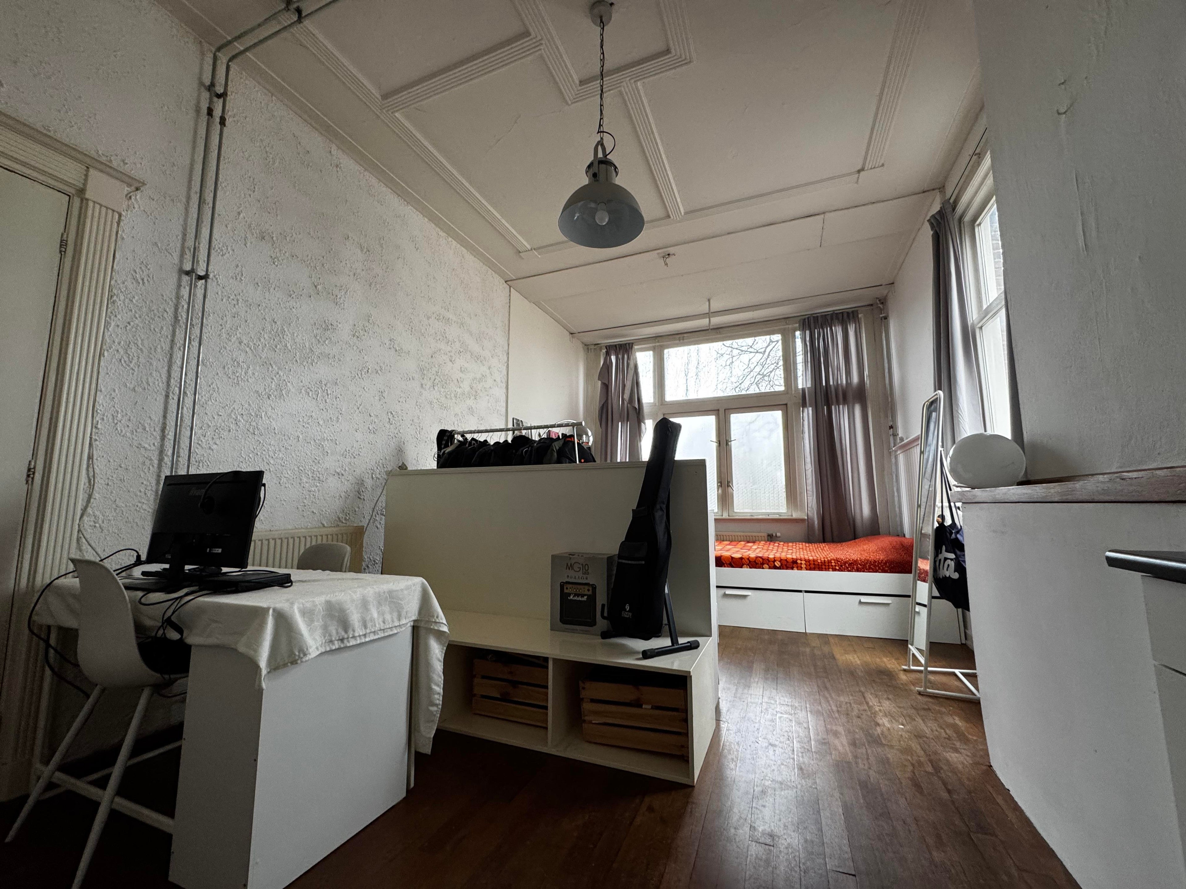 een comfortabele woonruimte op een fijne locatie, dichtbij het centrum en het station. de kamer is licht en ruim dankzij de grote ramen die zorgen voor veel zonlicht. uniek aan deze kamer is het eigen keukentje, wat extra privacy en zelfstandigheid biedt. daarnaast beschikt de kamer over een eigen wastafel.