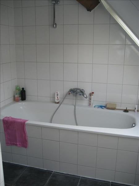 De badkamer is modern, fraai betegeld, en voorzien van een toilet, vaste wastafel en een ligbad!