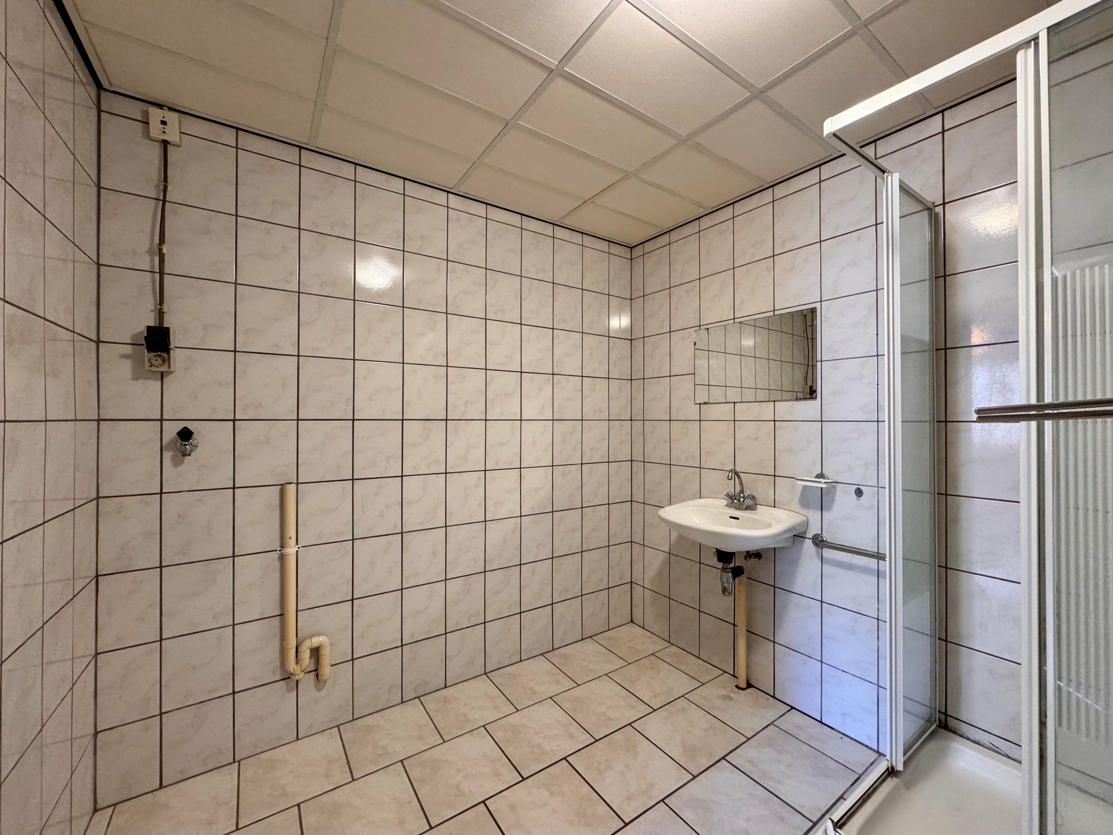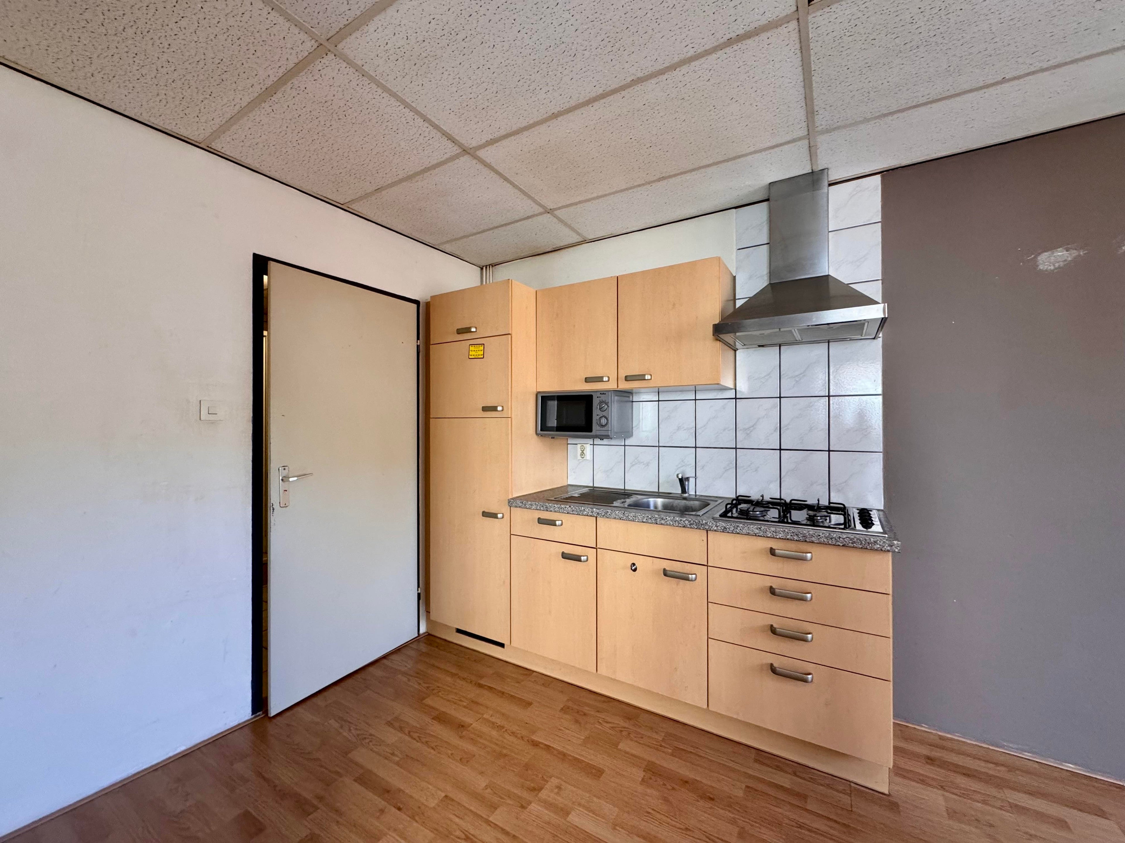 Ruime woonkamer met open keuken. De keuken is voorzien van een koelkast, diepvries, magnetron, spoelbak, gas kookplaat en afzuigkap. Tevens beschikt het appartement over een aparte slaapkamer. Ruime, volledig betegelde, badkamer, voorzien van wastafel, douche, toilet en aansluiting voor de wasmachine.