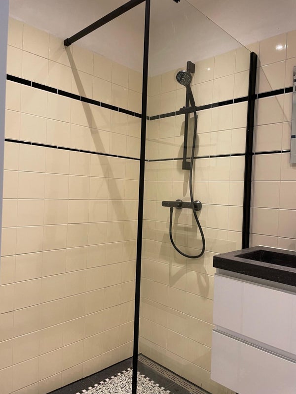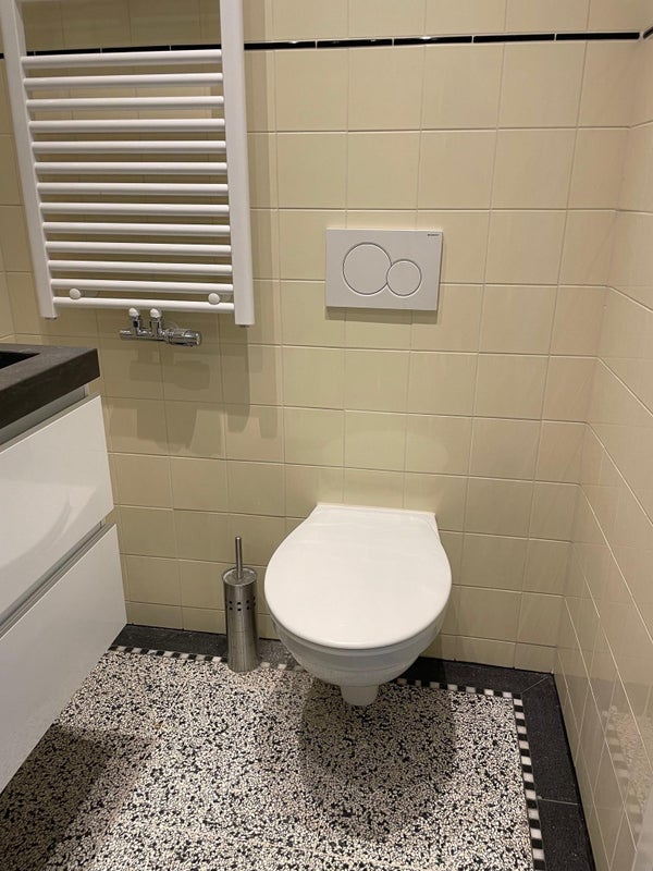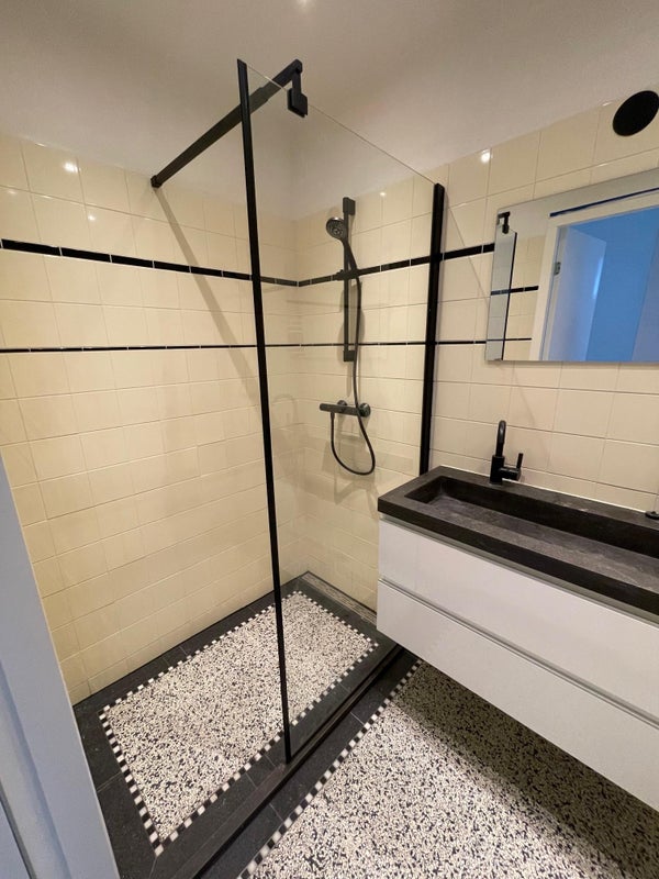 De badkamer is stijlvol en praktisch ingericht met een ruime douche, een dubbele wastafel en toilet. Zo start en eindig je je dag in comfort en luxe, perfect voor zowel een snelle ochtendroutine als ontspannende momenten na een drukke dag.