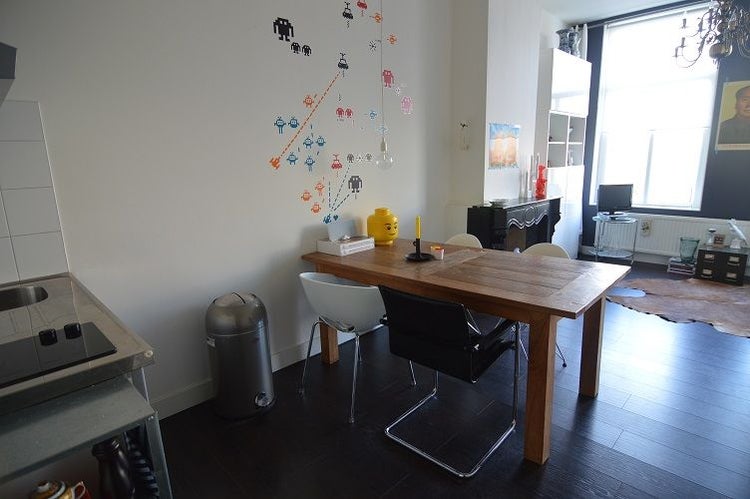 Through the shared entrance you have access to the studio which is situated on the first floor. The studio has a living room with open kitchen. The kitchen has an electric cooker, refrigerator, freezer and extractor fan. The living room has two beautiful tall windows and a cozy fireplace.