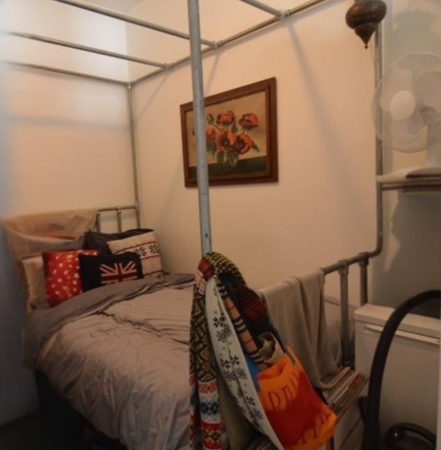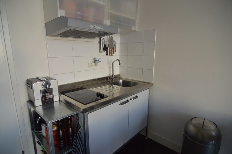 De studio heeft een woonkamer met open keuken. De keuken is voorzien van een elektrische kookplaat, koel,-vrieskast en een afzuigkap. De woonkamer heeft twee mooie hoge ramen en een gezellige schouw. De studio heeft ook een aparte slaapkamer.