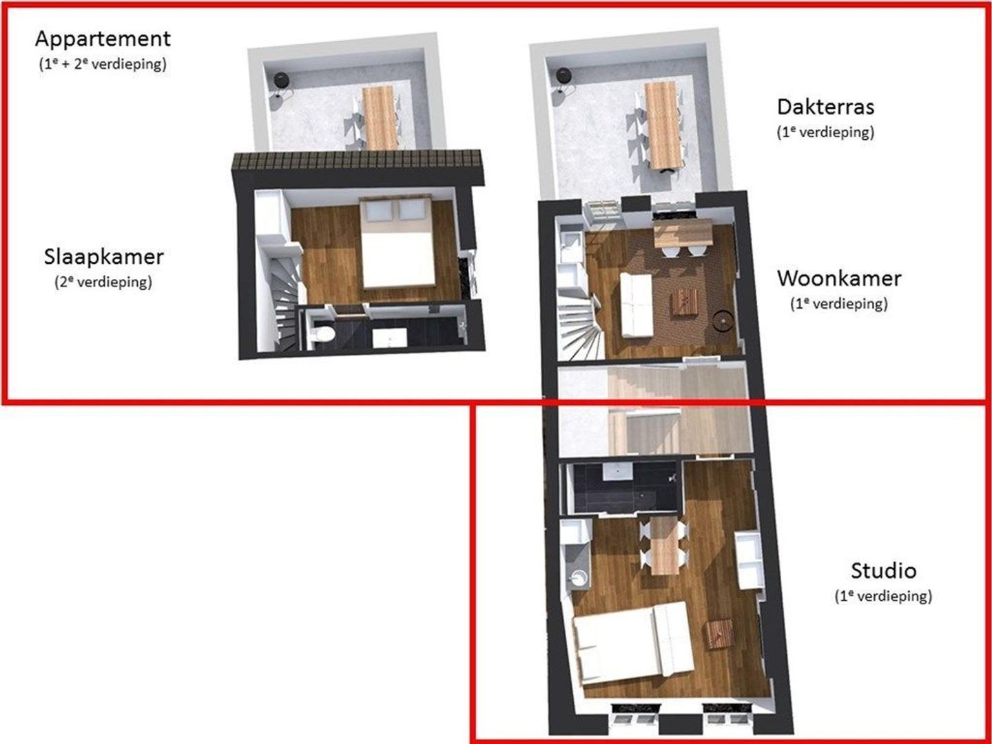 - PVC laminaatvloer (geluidsarm, voelt warm aan en zeer onderhoudsvriendelijk);
