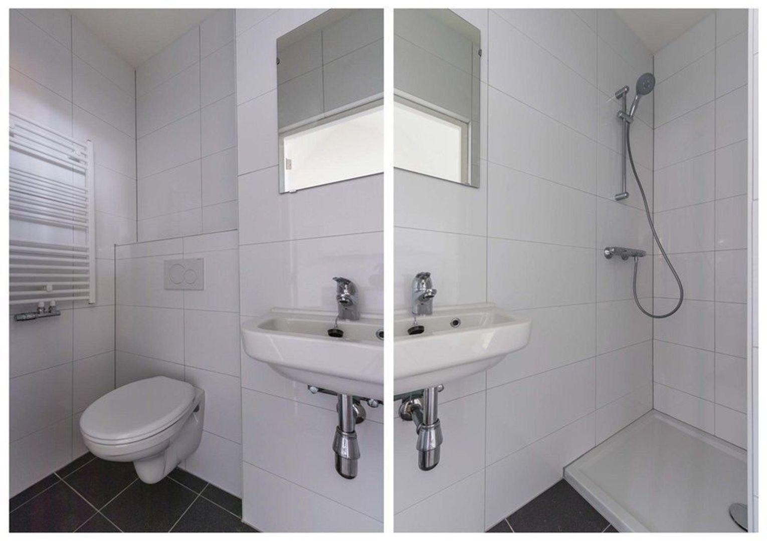 - badkamer voorzien van douche, wastafel en hangend toilet