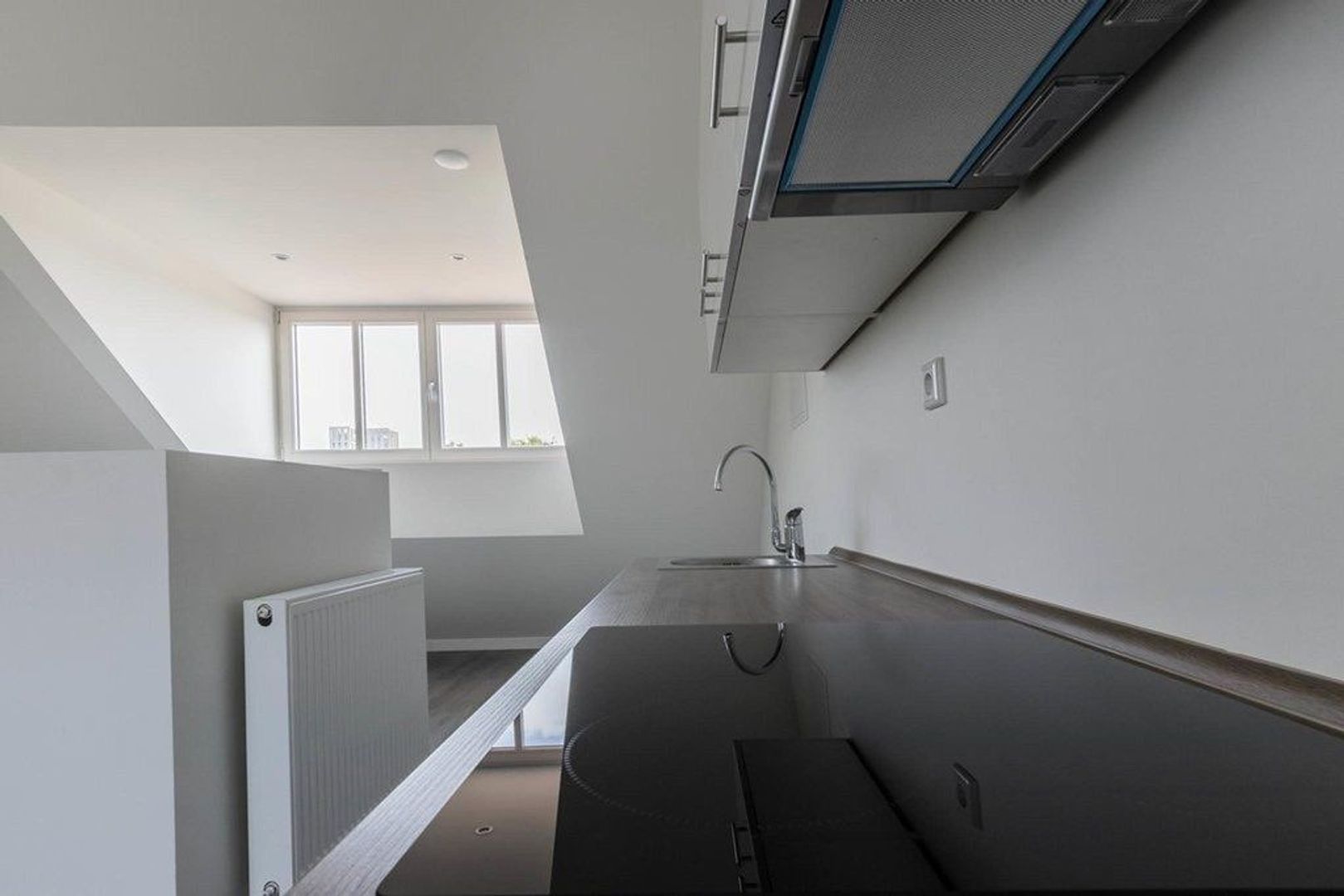 - keuken voorzien van koelkast, kleine spoelbak, oven, keramische kookplaat en afzuigkap
