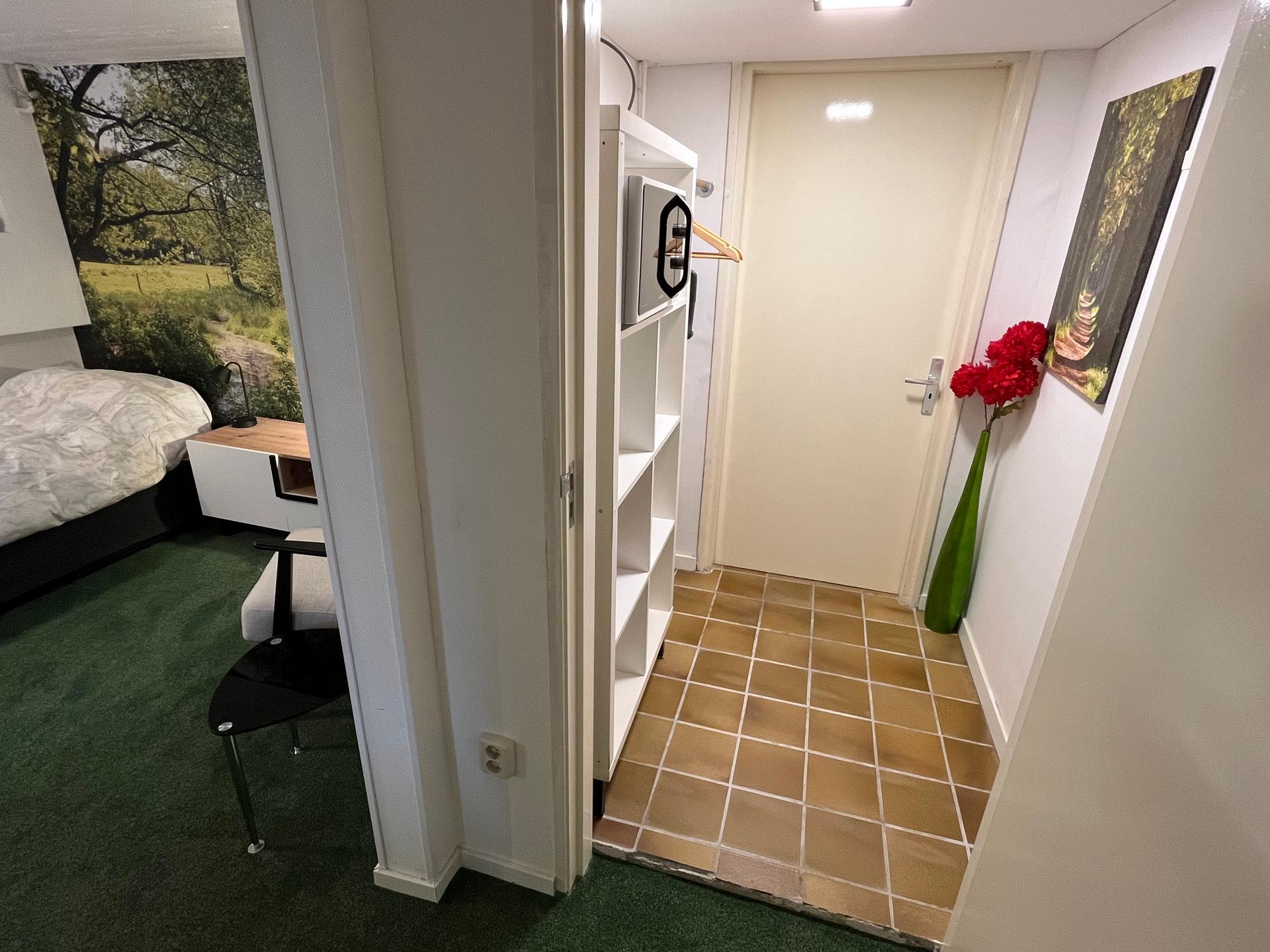 Gemeubileerd. De universiteit is op 3,5 km, winkels op 1,5 km. bos (=Veluwe) op 500 m , treinstation op 5 km. De ruimte: entree via garage, binnenkomst in hal; woon-/slaapkamer met bed, fauteuil, eettafel met stoelen; volledig uitgeruste keuken met inductiekookplaat, koel-/vriescombinatie; badkamer met douche, toilet en wastafel.