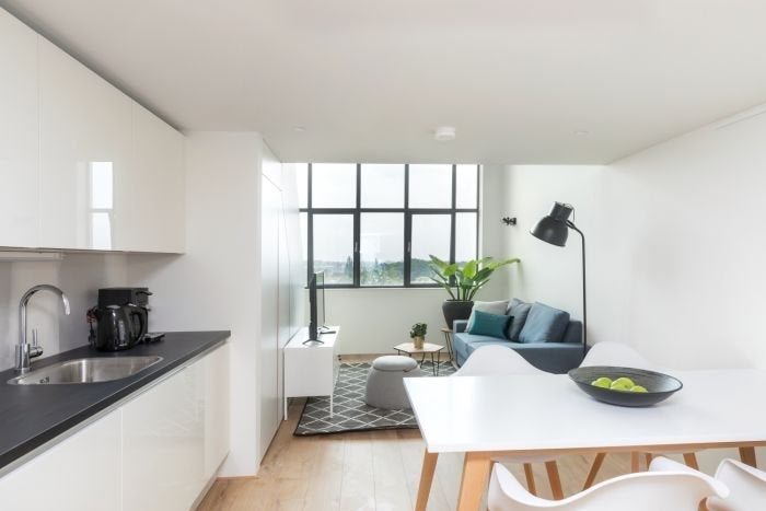 De woonkamer is ca. 24 m² met open keuken. De moderne keuken is voorzien van de volgende inbouwapparatuur: vaatwasser, koelkast, afzuigkap, inductie kookplaat en combi magnetron met oven. De badkamer is voorzien van zwevend closet, inloopdouche en wastafel met meubel.
