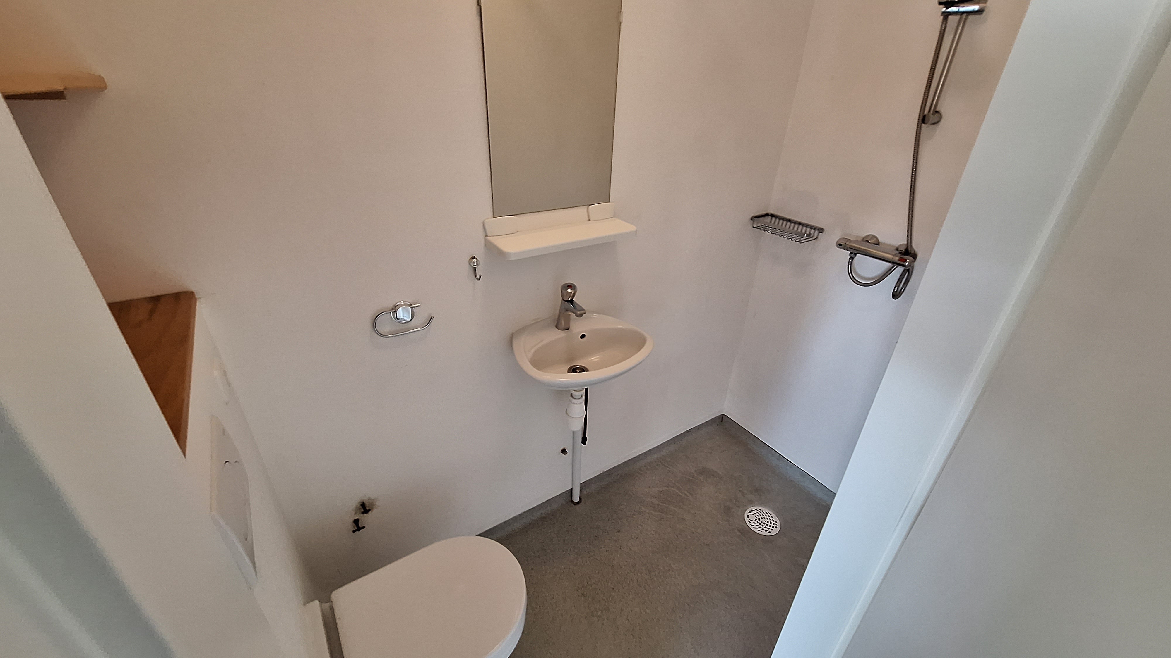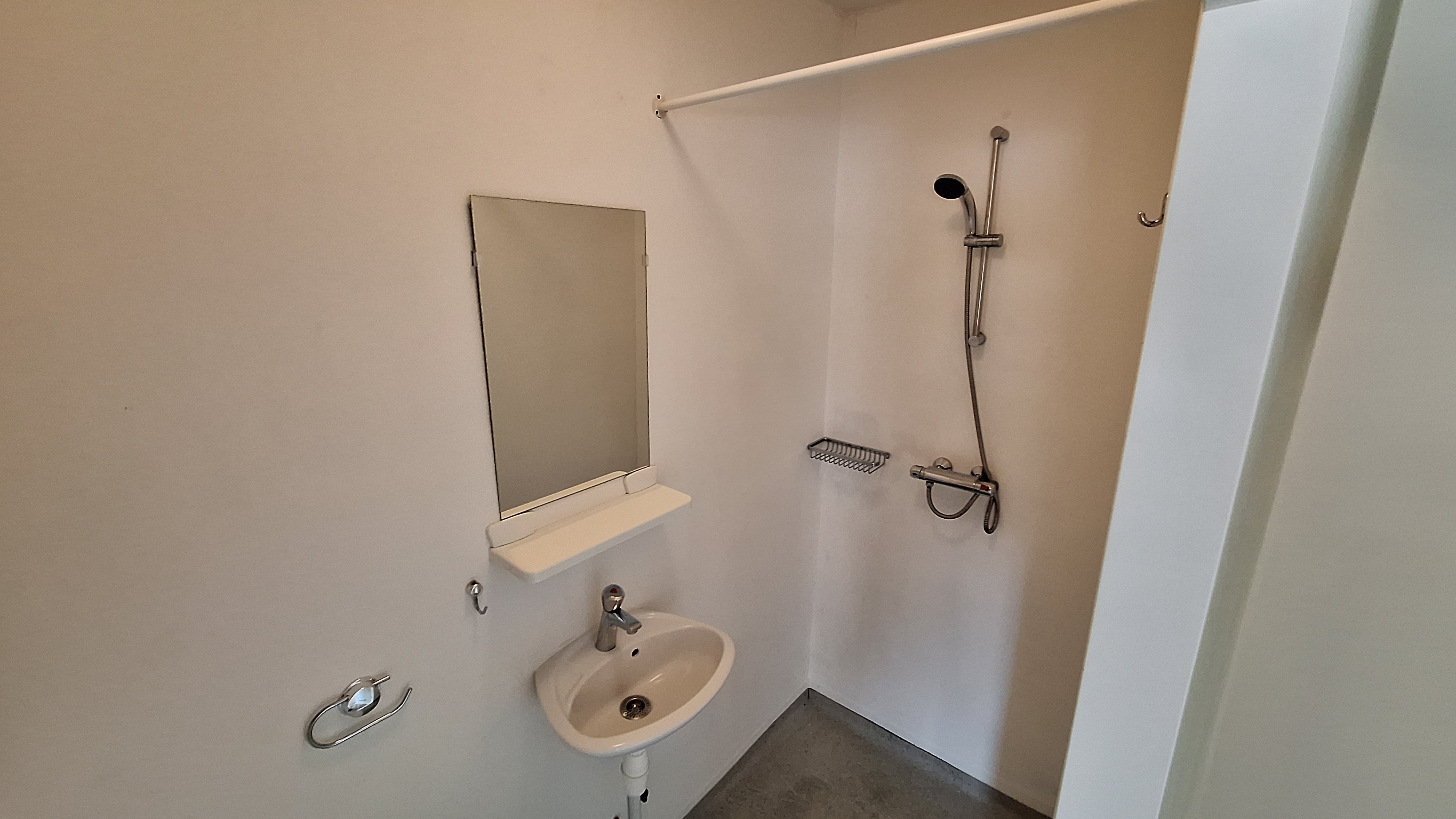 Indeling; gezamenlijke entree / centrale hal met trapopgang naar de tweede verdieping en toegang de studio. We betreden de woning in de centrale hal met toegang tot het sanitair en woongedeelte. Het sanitair bestaat uit een inloopdouche, wastafel en toilet. Het woongedeelte heeft twee grote ramen aan de voorzijde en is voorzien van een laminaatvloer.